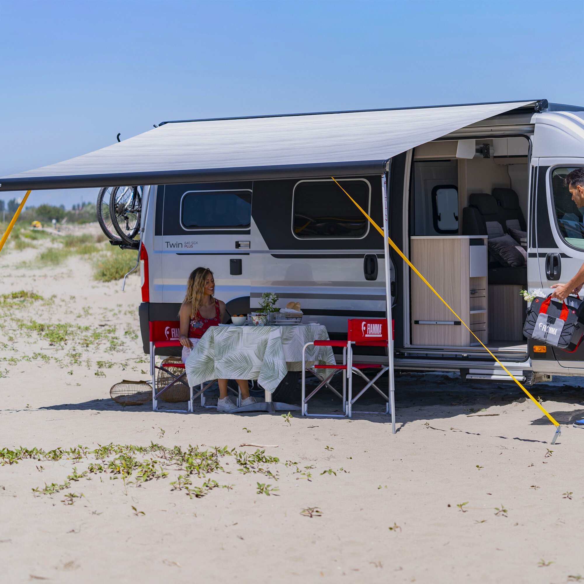 The Tie Down S is the ideal tensioning strap for a secure and stable attachment of your awnings F45, F65, F80 and your Privacy side walls. It is tensioned at the front in the front cover or fastened with the buckle to the side walls of the Privacy Room. Scope of delivery: 2 tensioning straps (3 m each), 2 ground spikes, 2 tension springs, 2 front wall hooks (for F45, F65, F80 with double piping rail).