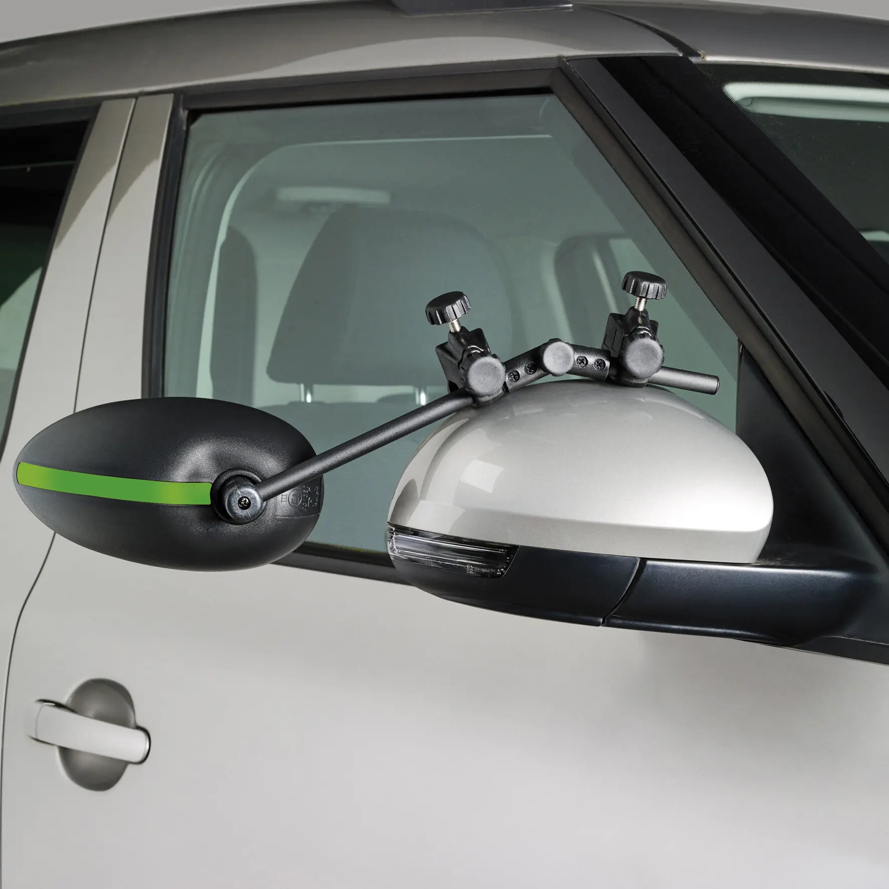 The caravan clamping mirror Speed Fix Mirror is suitable for all modern towing vehicles and characterised by its aerodynamic design, which minimises vibrations. Its innovative, patented clamping system allows easy installation at the top or bottom of the vehicle mirror. With flat glass and coloured safety stripes in green, orange and yellow.