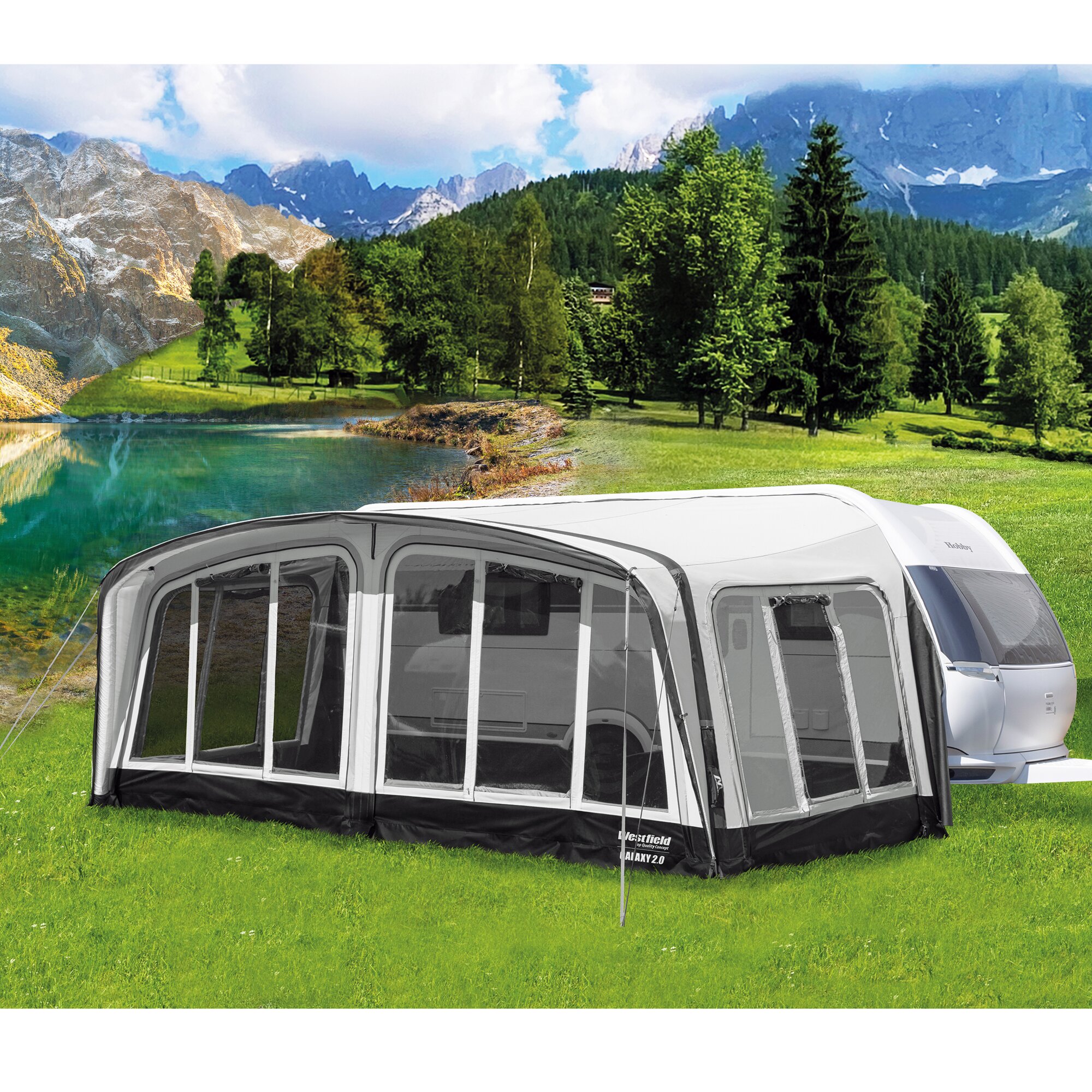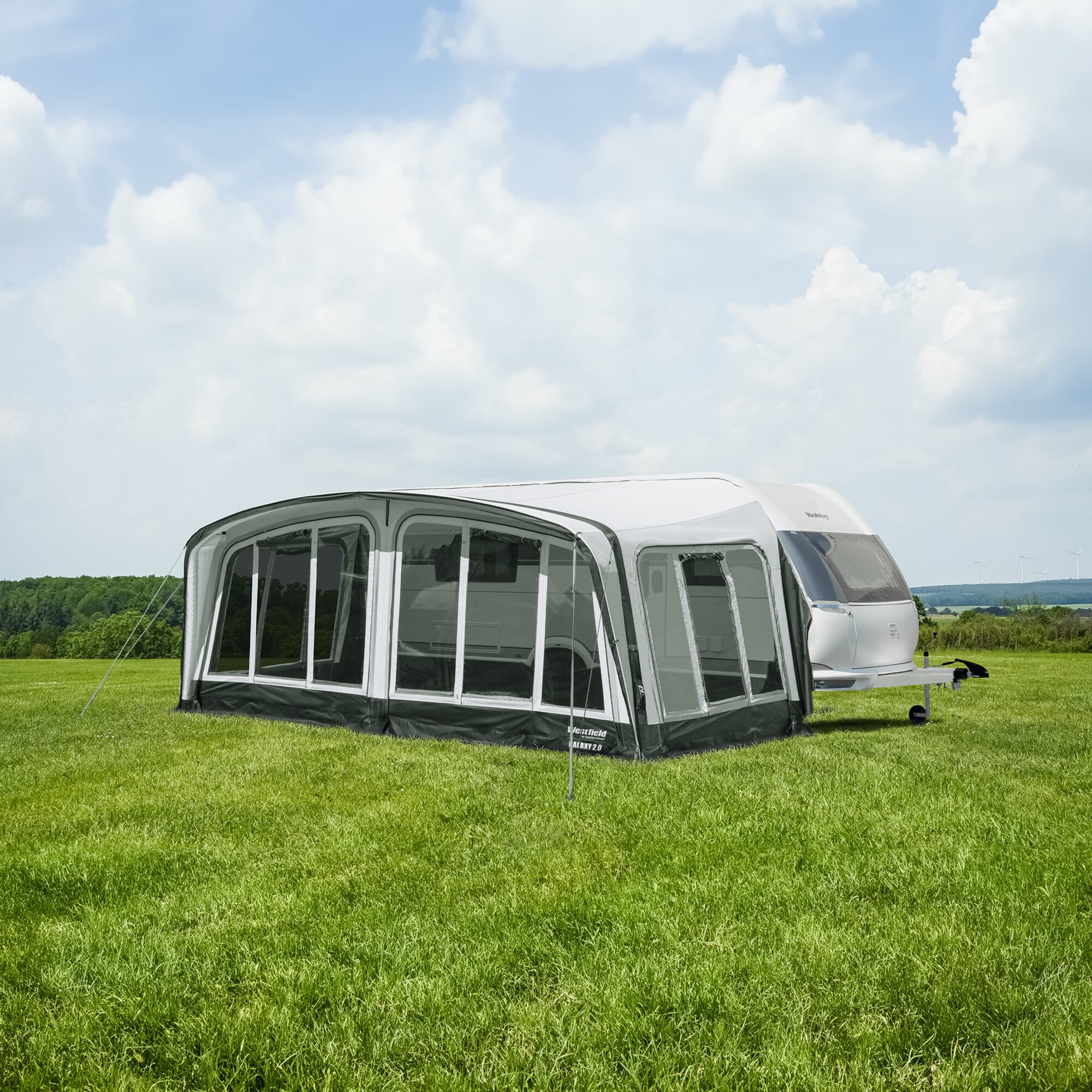 The luxurious inflatable awning Galaxy by Westfield TQC is made in Germany with the best European fabrics. Thanks to its design and modern shape, you will feel even more comfortable on holiday. The large windows that can be closed from the inside, the depth of 250 cm and the headroom in the awning ensure that you have a very pleasant feeling of space. The indoor climate is also optimal in any weather thanks to the high-quality AIRTEX® and TenCate® All Season materials and the many ventilation options. With the Galaxy luxury inflatable awning attached to your caravan, you are ready for your next holiday. Suitable for seasonal use.