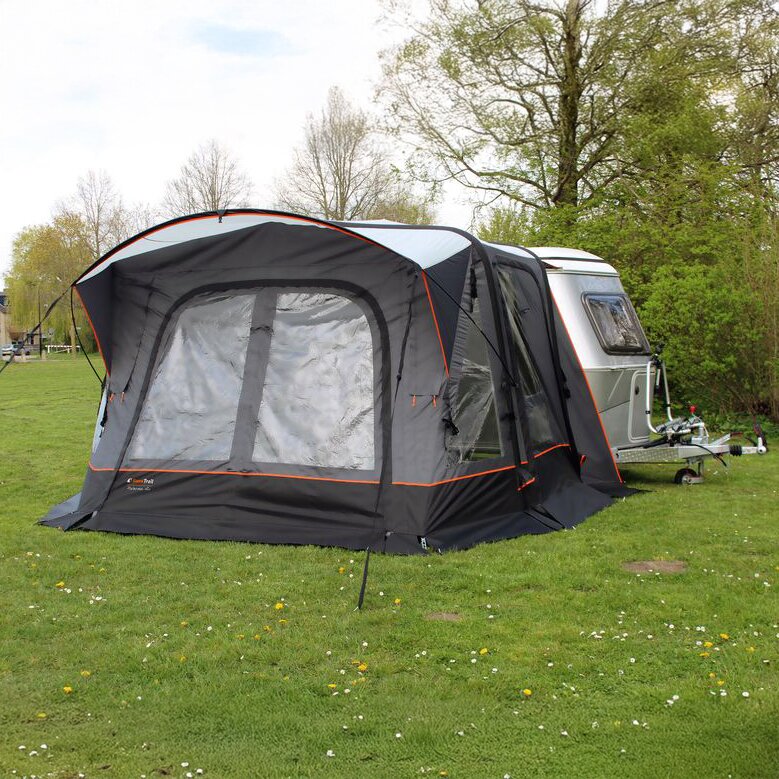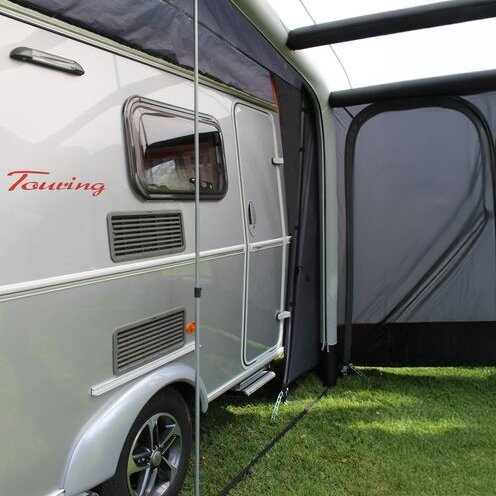 The inflatable caravan tent Palermo Air was specially developed for caravans with a lifting roof (e.g. Hymer Eriba Touring models except for model Puk) and a connection height of 187 – 220 cm. Thanks to the air tube system, it is quick and easy to set up. The living space offers plenty of room for a table and chairs and other camping equipment. The supplied stabilising tubes are inserted against the ceiling for a taut roof and additional wind stability. Two closable mesh ventilation windows under the canopy provide permanent ventilation. The canopy itself provides shade and protects you from rain when entering the tent. The tent has an additional entrance door on both sides with large windows with covers and is also equipped with GRP stabilisation tubes and support poles.