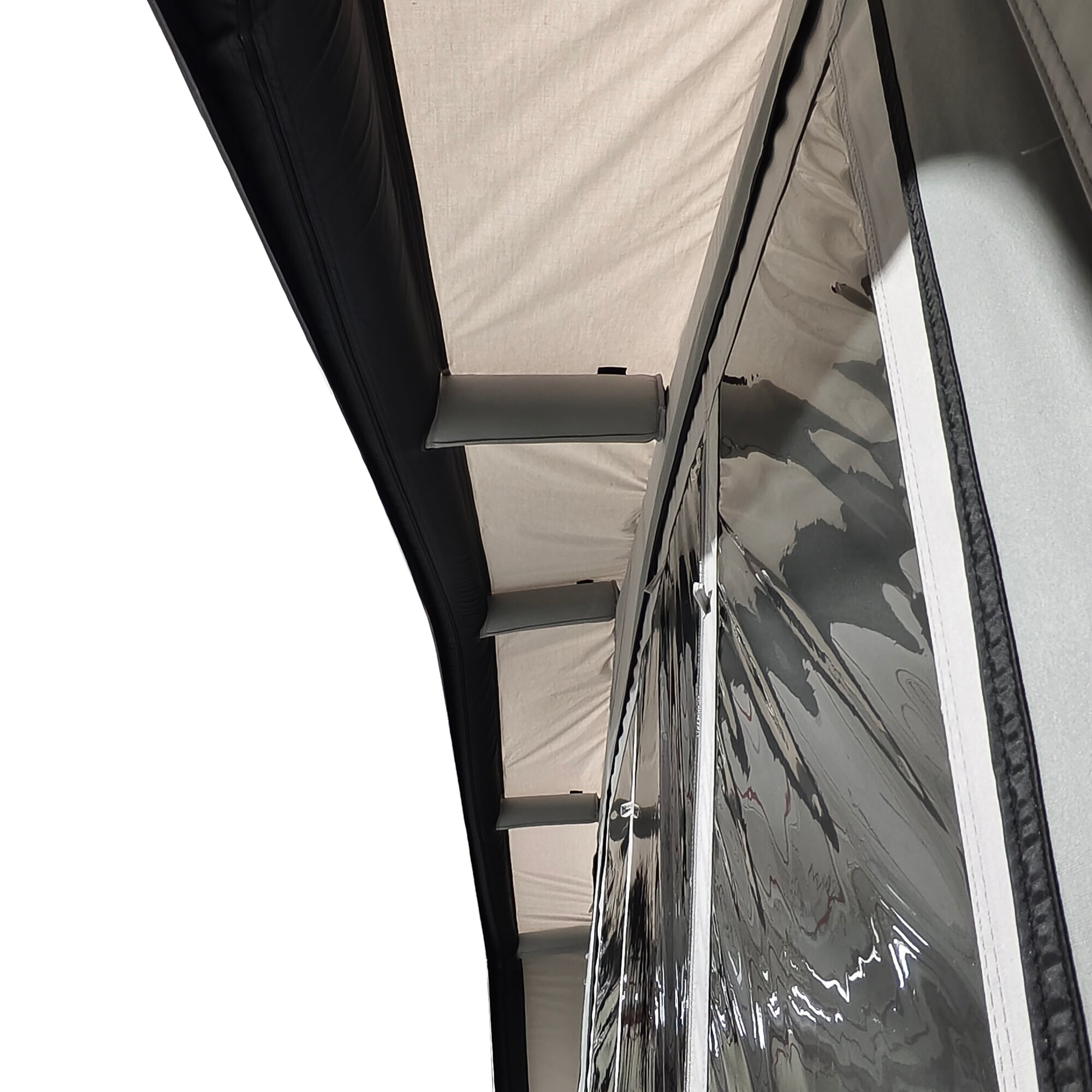 Thanks to the AAS air technology, the inflatable awning Pluto is quick and easy to set up. It is pulled completely into the piping rail of your caravan. This means that all windows, doors and service hatches can be opened easily and that the sides of your caravan are sealed against wind and weather. Thanks to the high-quality HydroTech® CottonTouch material, the permanent ventilation and the tinted windows, the temperature inside the awning will be pleasant even on hot summer days. The removable front and side walls are equipped with mosquito nets and can be used as needed. This model is additionally equipped with a connection for the sun canopy Canopy Shady Pro.