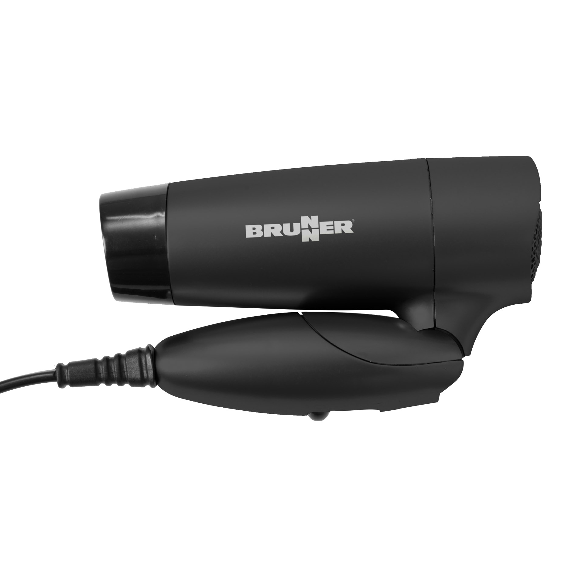 Compact travel hair dryer with space-saving folding handle. Can be operated with both 230 V and 110 V. Housing made of resistant plastic. With convenient storage bag.