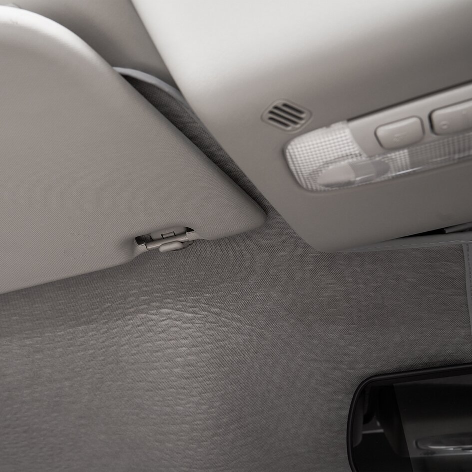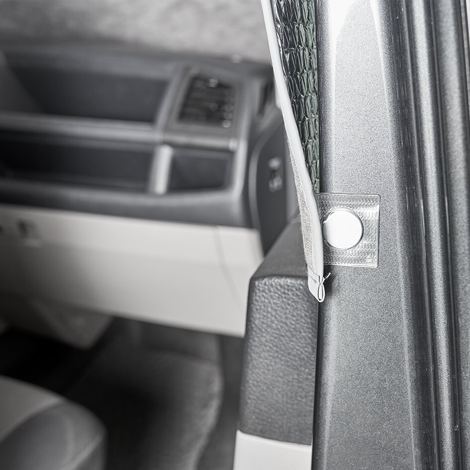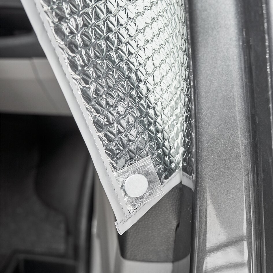 3-piece sets made of 4 mm thick thermal foil for effective protection against cold and noise. The grey fleece facing the living area ensures a pleasant room atmosphere. The coated outer surface insulates the interior against heat, and the air cushion between the window and the insulating mat provides thermal insulation. The front section is attached using straps between the window and the dashboard and between the sun visor and the headliner. The side sections are attached with magnets and clamped into the doors.