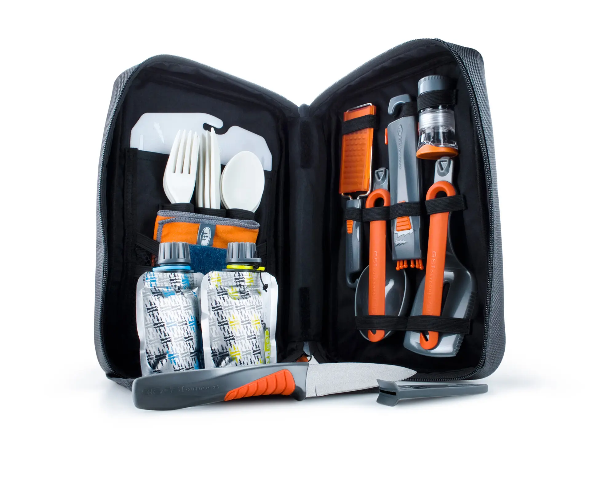 Kitchen set for picnics, camping or outdoor use. Comes in a handy bag. Contents: folding cooking spoon, folding spatula, retractable whisk, kitchen knife, grater, cutting board, 4 cutlery sets (knife, fork, spoon), towel, sponge, two folding storage bottles for e.g. oils, and a waterproof 4-chamber spice shaker.