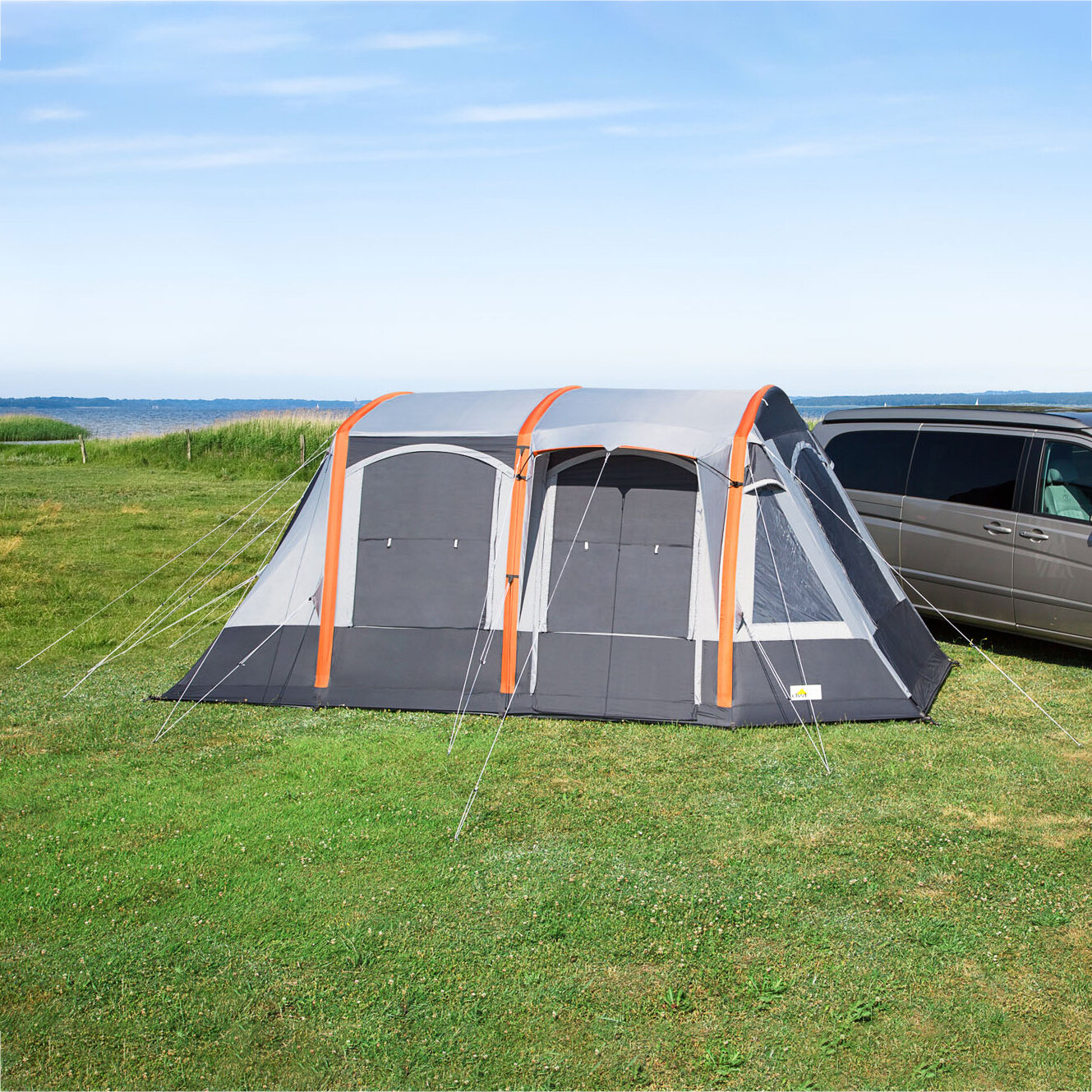 | Lieferumfang Zelte: | 2 Aufstellstangen, Abspannmaterial, Airtube, Gardinen, Luftpumpe, Zeltboden, Packtasche, Vordachstange, Zelt |