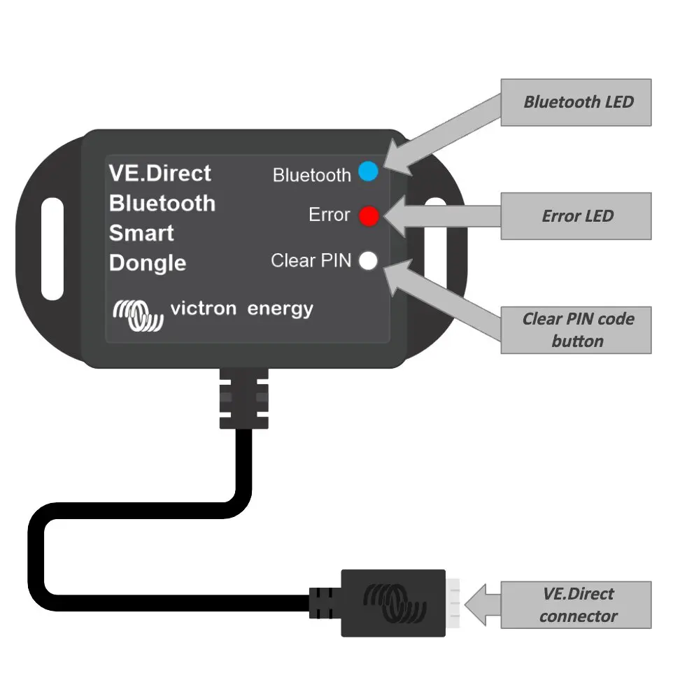 The VE.Direct Bluetooth Smart Dongle connects to a non-Bluetooth enabled VE.Direct Victron product, which can then be accessed via Bluetooth using the VictronConnect app to facilitate monitoring, setup and firmware updates.