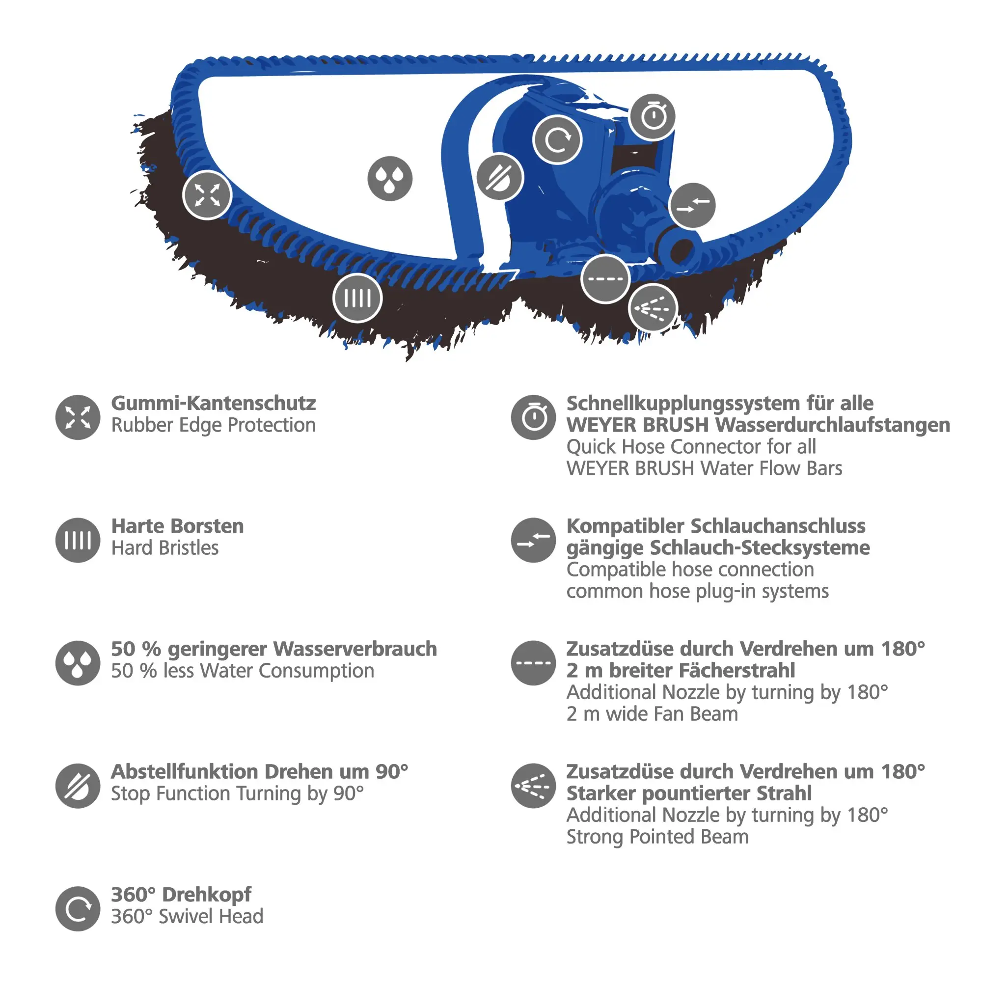 The Weyer washing brush with hose connection impresses with its high-quality workmanship, easy handling and a multitude of innovative features: