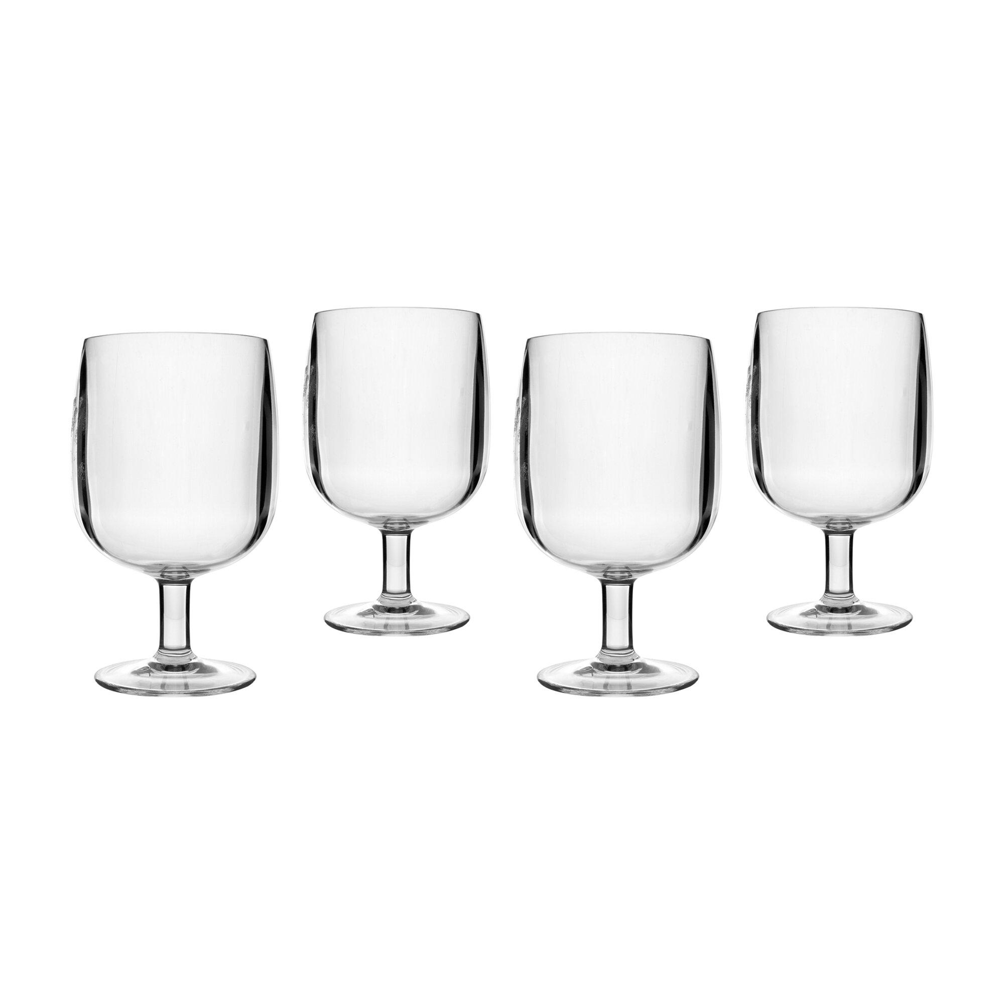 A set of 4 compactly stackable wine glasses. Made of strong plastic, practically unbreakable and lightweight. The glasses are BPA-free.