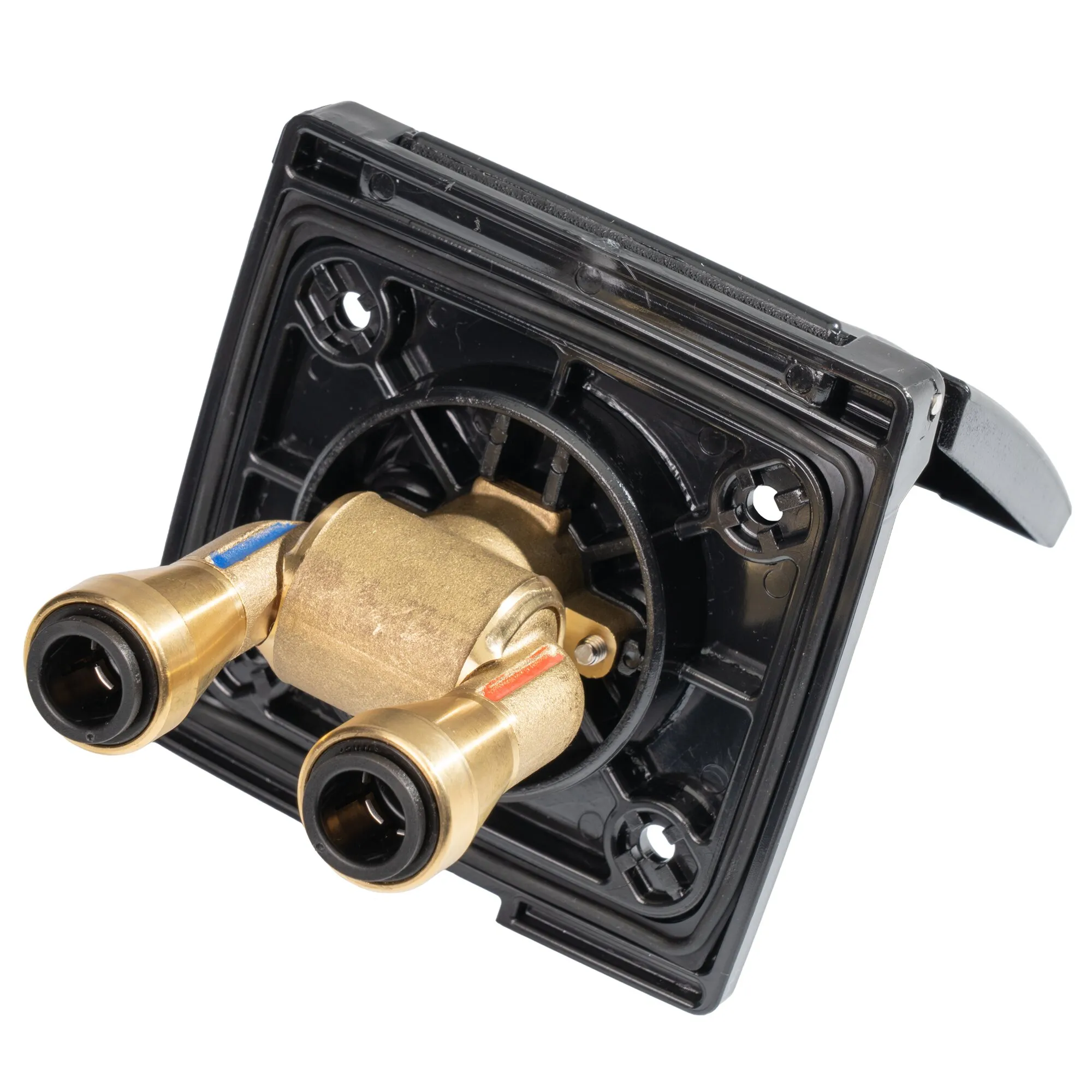 Außenduschanschluss für Warm- und Kaltwasser mit Temperaturregulierung und Abdeckung. Der 2 m lange Brauseschlauch mit Handbrause ist leicht abnehmbar, platzsparend zu verstauen und schnell montiert.
