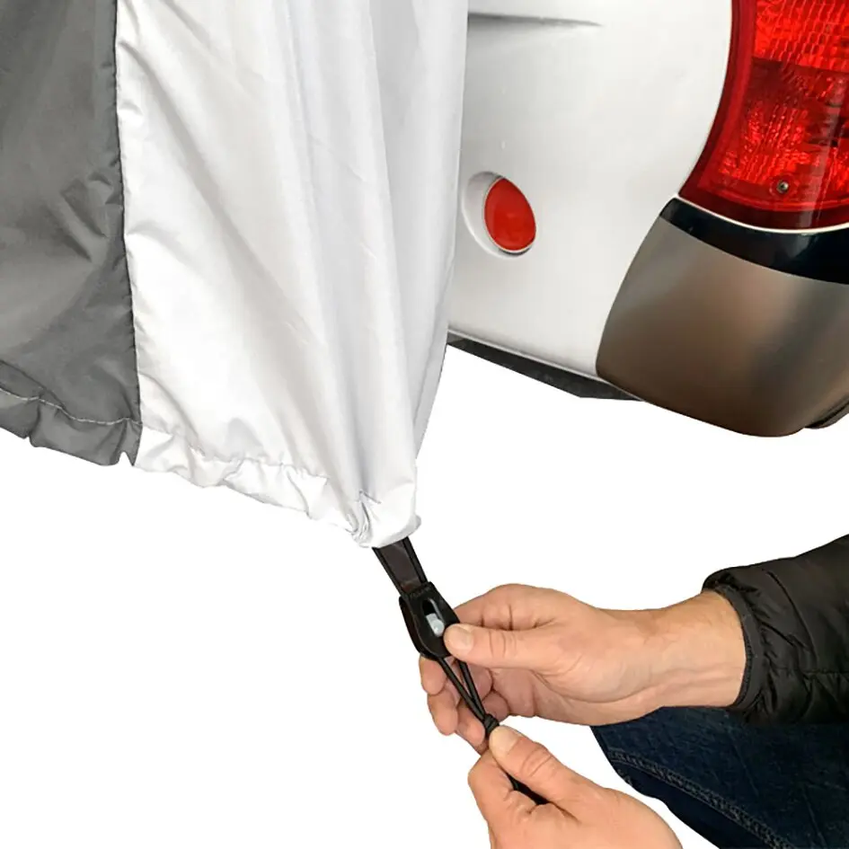 Sie schützt bis zu 2 Fahrräder zuverlässig beim Transport auf dem Heckbühnenträger des Reisemobils. Die kastenförmige Schutzhülle wird einfach von oben über die Fahrräder gezogen und ist nahezu rundum geschlossen. Eine große Frontklappe mit reflektierenden Reißverschlüssen ermöglicht den schnellen Zugriff, ohne die Hülle abnehmen zu müssen. Die integrierte, ca. 80 cm breite Bodenlasche aus robuster Gewebeplane dient als wirksamer Spritzschutz. Gummizüge an den Seiten und mehrere Gurte halten die Hülle straff und sicher – ein zusätzliches Gurtsystem ist nicht nötig. Das strapazierfähige Polyestergewebe mit hochwertiger PU-Beschichtung sorgt für lange Lebensdauer, während Kennzeichen und Lichtleiste sichtbar bleiben. Material Polyester 300D, hinten mit hochwertiger PU-Beschichtung.