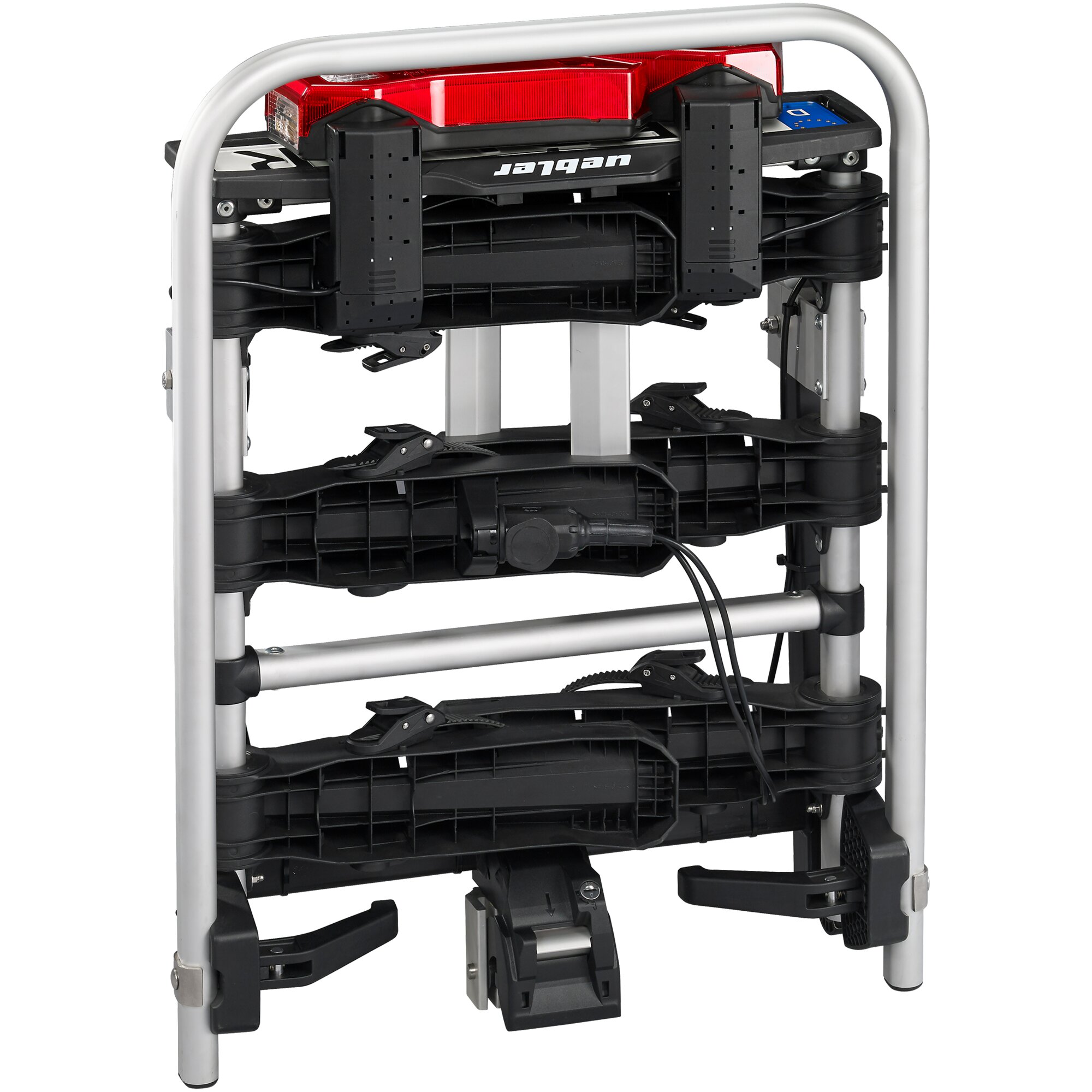 Für 3 Fahrräder mit bis zu 72 kg. Auslösen der Abklappfunktion mit Fußhebel. Extrabreite Radschienen für Reifen bis 4,5". Inkl. 10 Schlüsseln für die abschließbaren Befestigungskrallen.