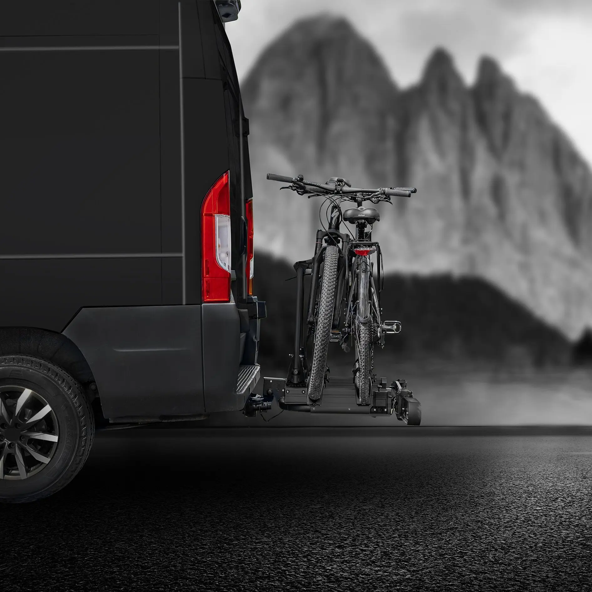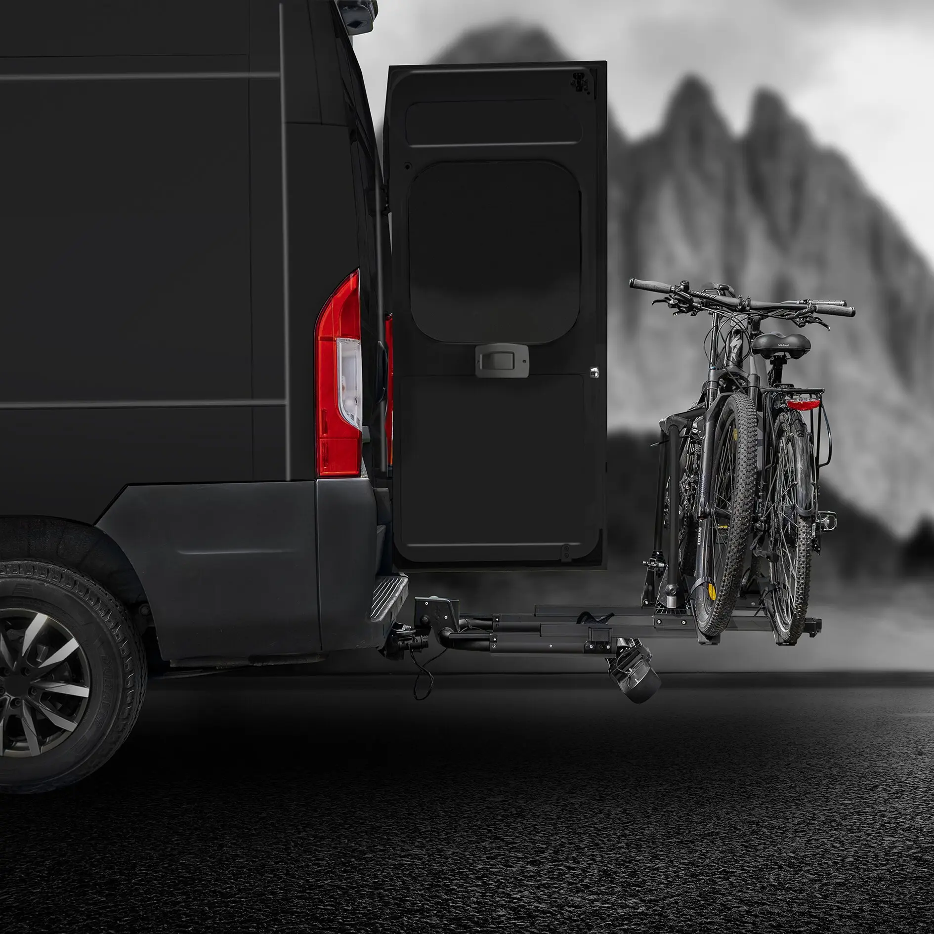 Zum Transportieren von Fahrrädern auf der Anhängerkupplung von Kastenwagen, Wohnmobilen, Hochdachkombis mit Heckflügeltüren und Pkws. Die Gleitschienen (Auszug ca. 70 cm) ermöglichen die Öffnung von Türen bis zu 85 cm Breite.
