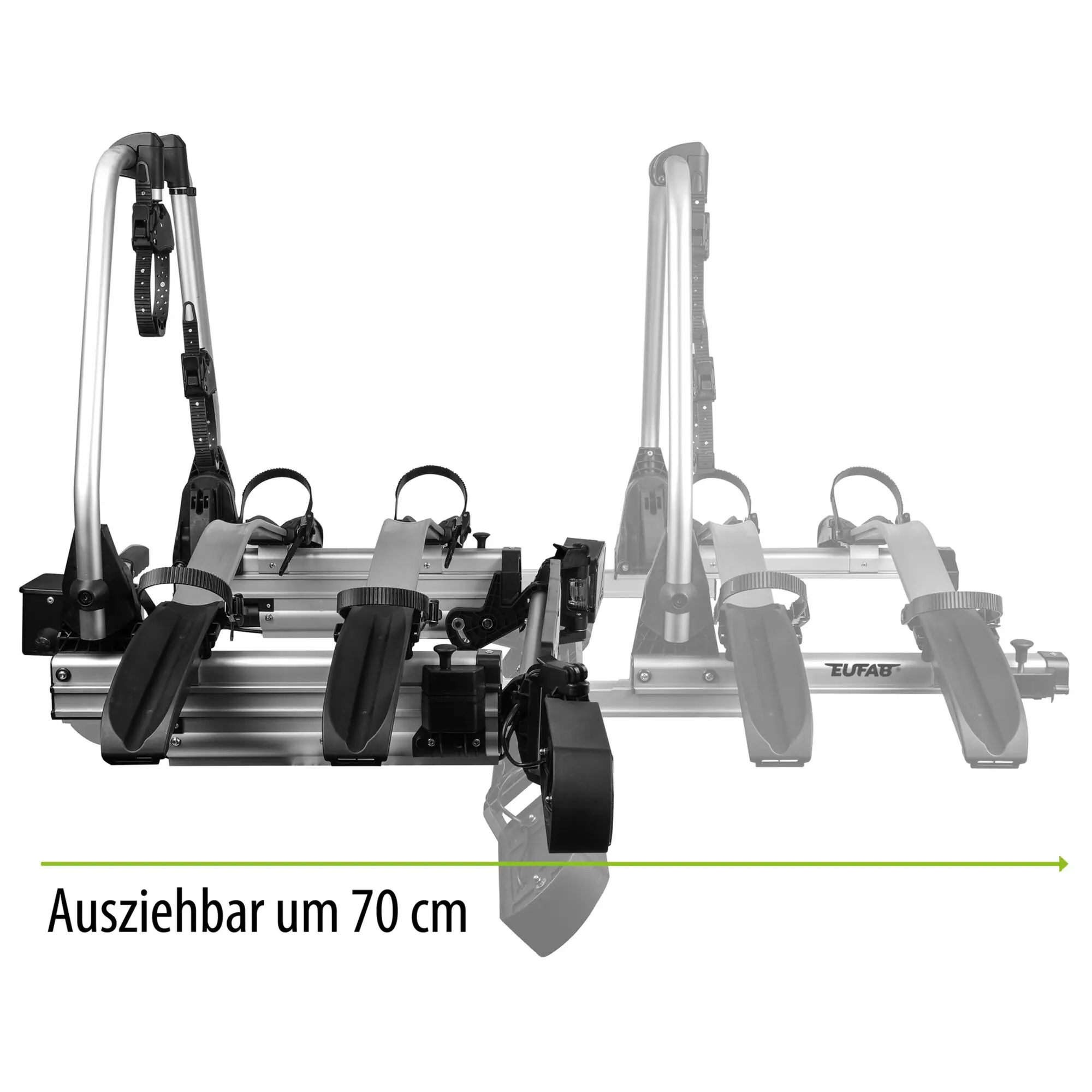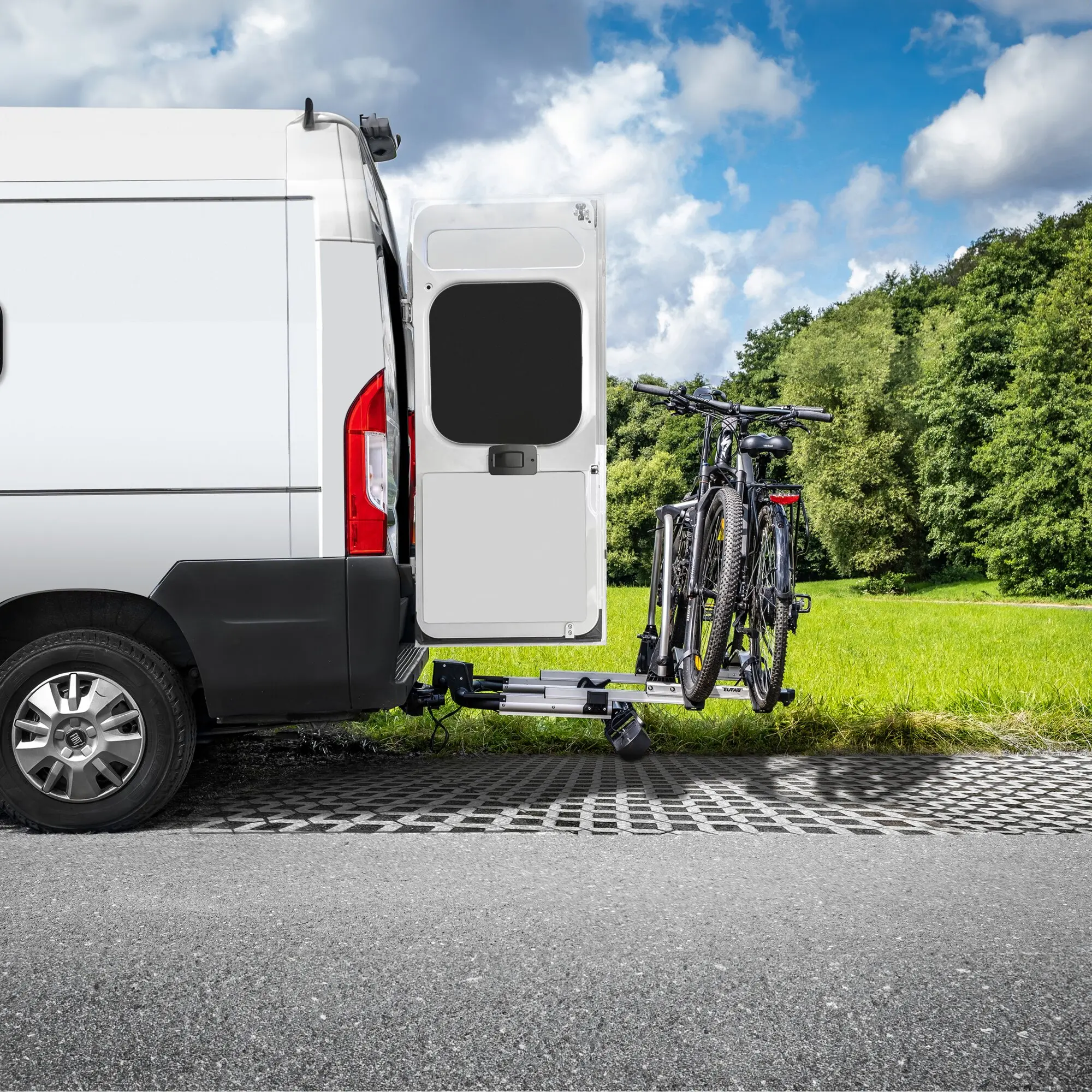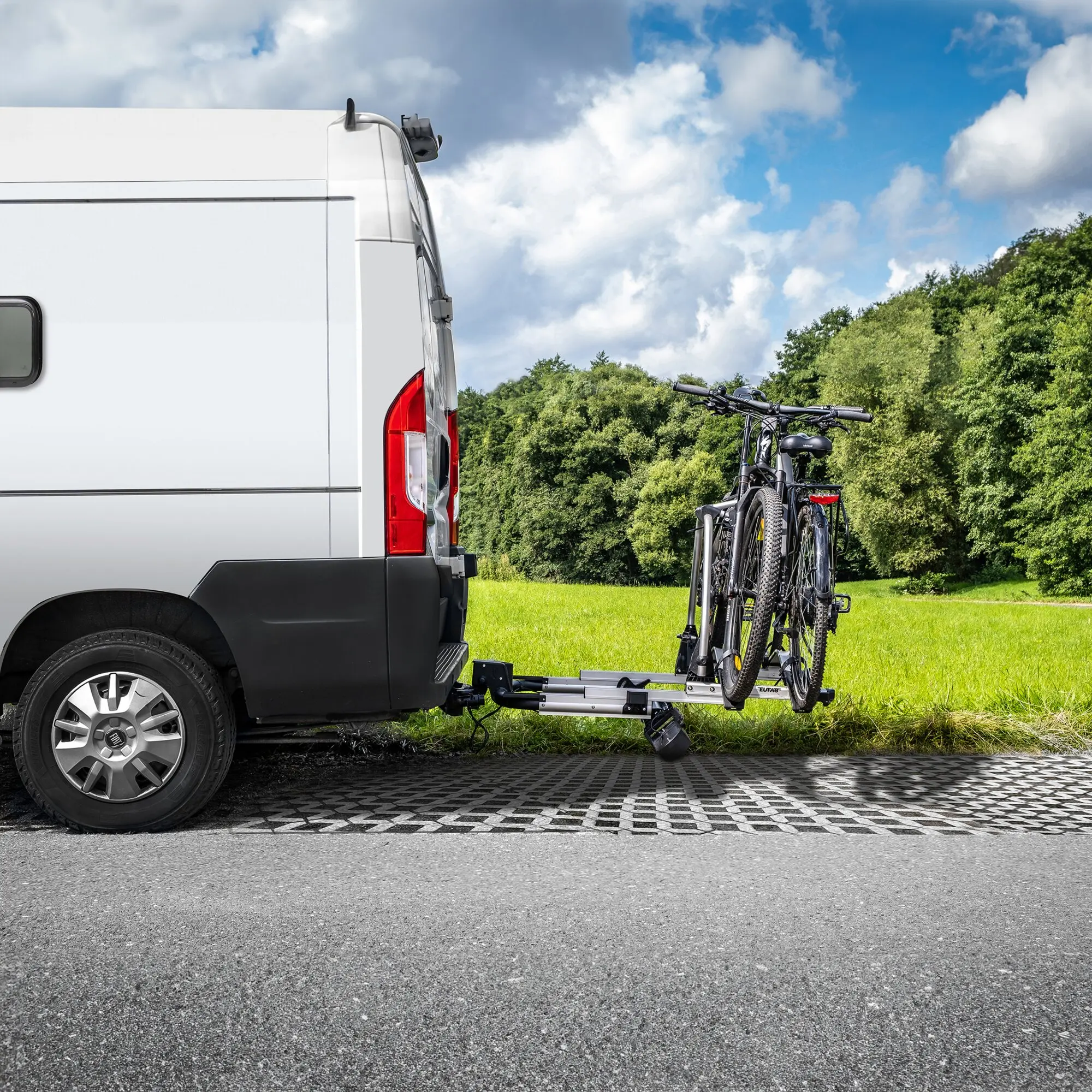 Zum Transportieren von Fahrrädern auf der Anhängerkupplung von Kastenwagen, Wohnmobilen, Hochdachkombis mit Heckflügeltüren und Pkws. Die Gleitschienen (Auszug ca. 70 cm) ermöglichen die Öffnung von Türen bis zu 85 cm Breite.