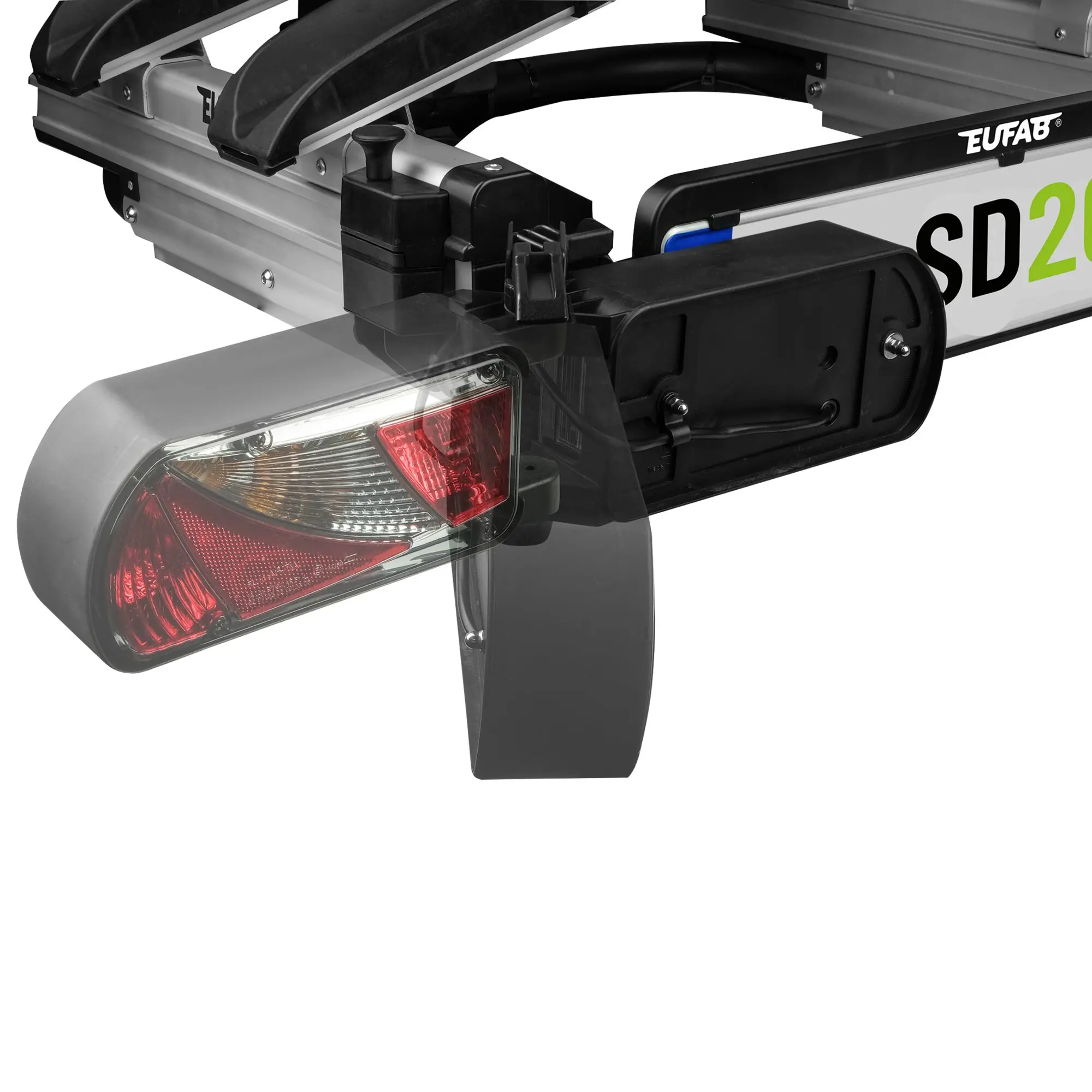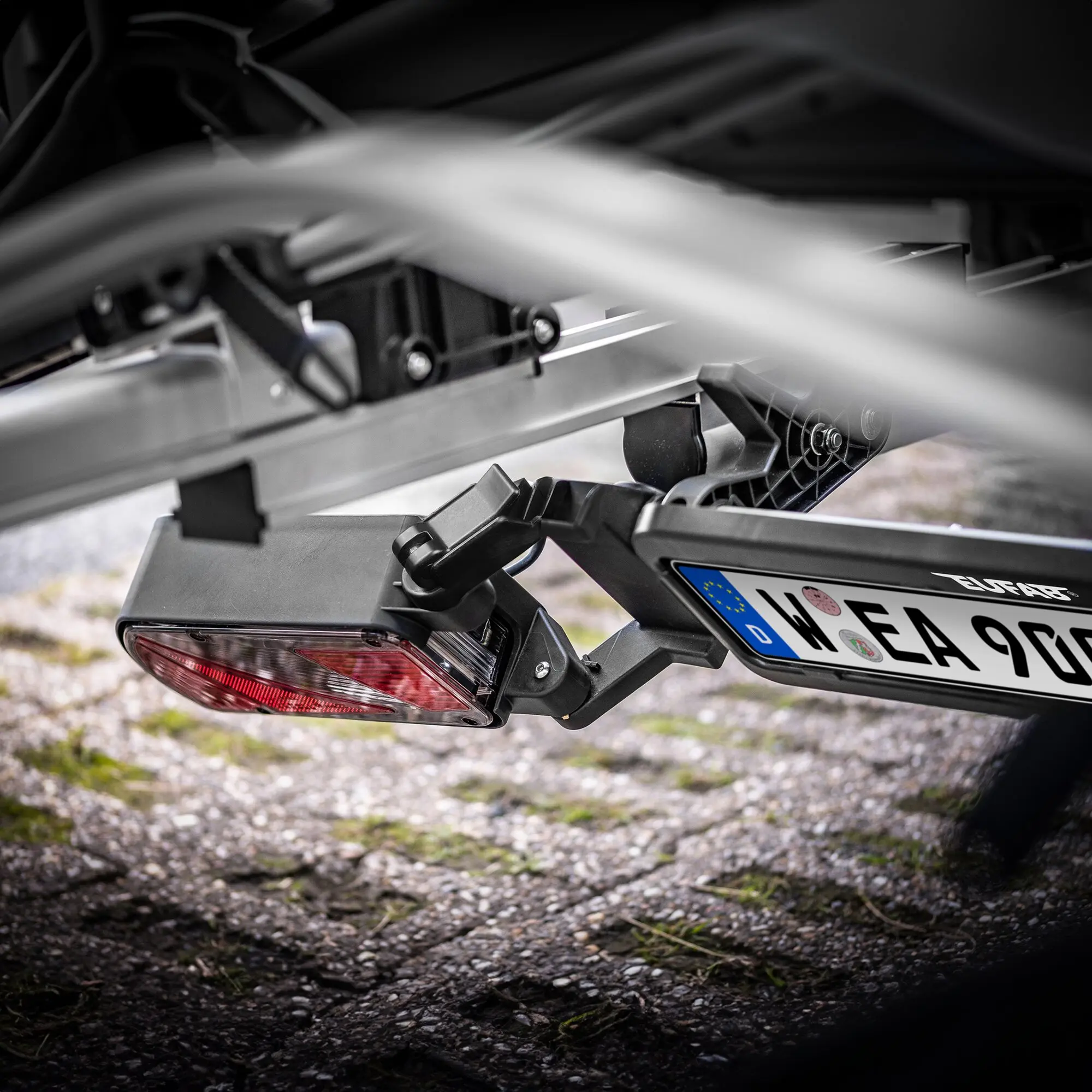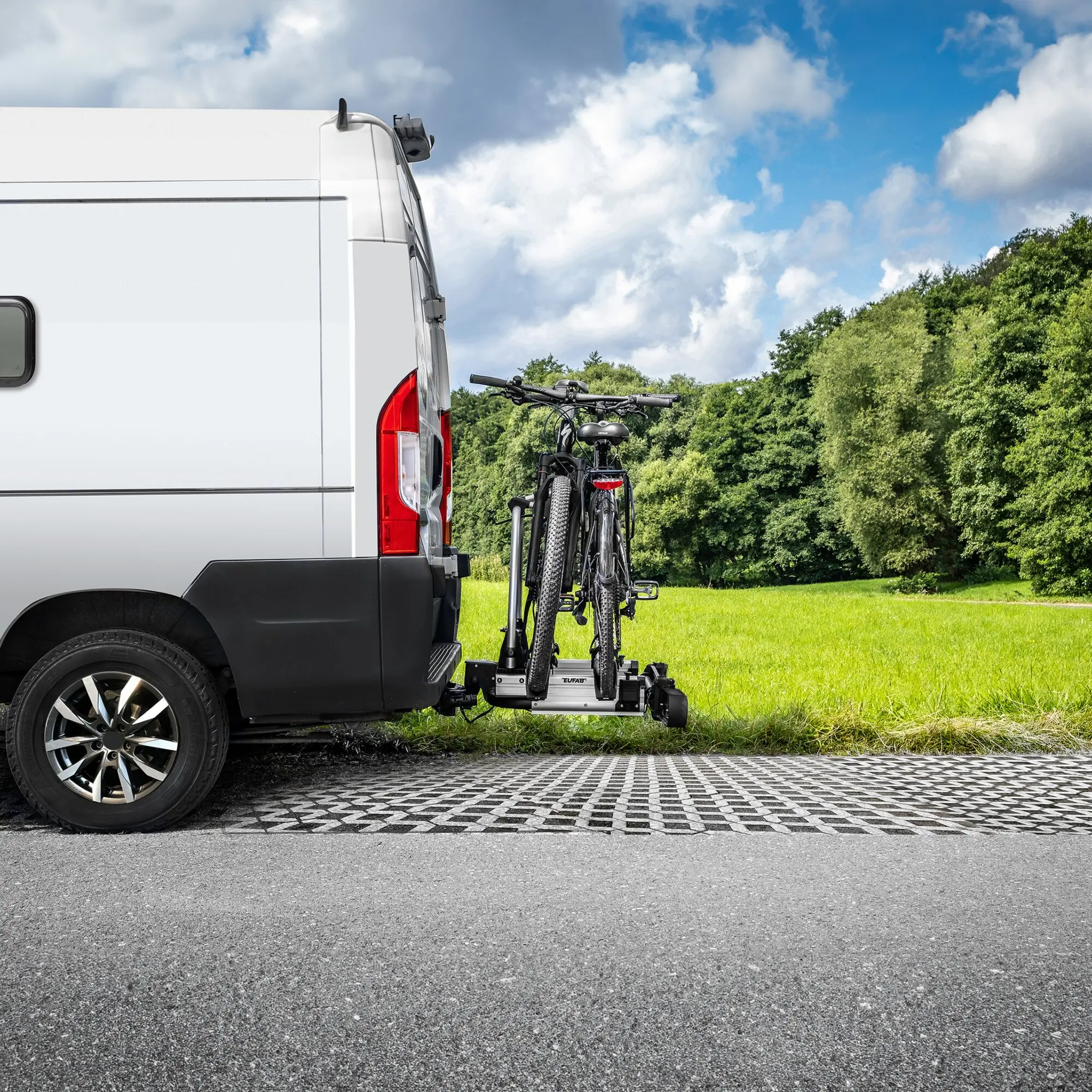 Zum Transportieren von Fahrrädern auf der Anhängerkupplung von Kastenwagen, Wohnmobilen, Hochdachkombis mit Heckflügeltüren und Pkws. Die Gleitschienen (Auszug ca. 70 cm) ermöglichen die Öffnung von Türen bis zu 85 cm Breite.