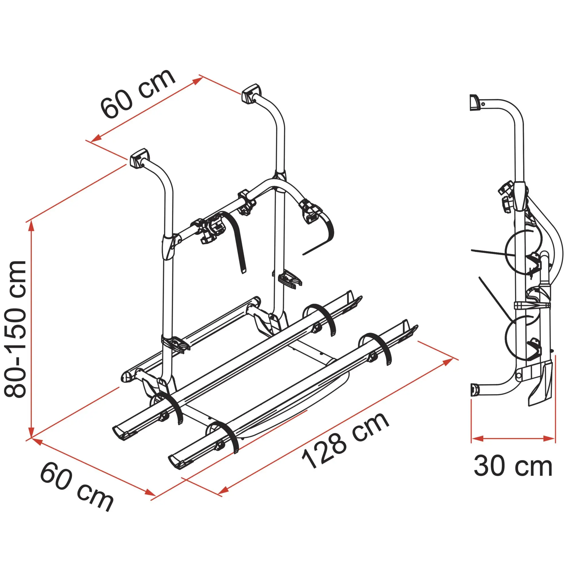 Der teleskopierbare Fahrradträger. Die lange Ausführung der Pro Serie ermöglicht eine individuelle Höheneinstellung für noch mehr Stabilität. Durch die verstellbare Struktur kann die Anbauhöhe beliebig geändert werden. Von 80 cm auf 150 cm regulierbar, um sich den verschiedenen Anbringungsmöglichkeiten anzupassen.
