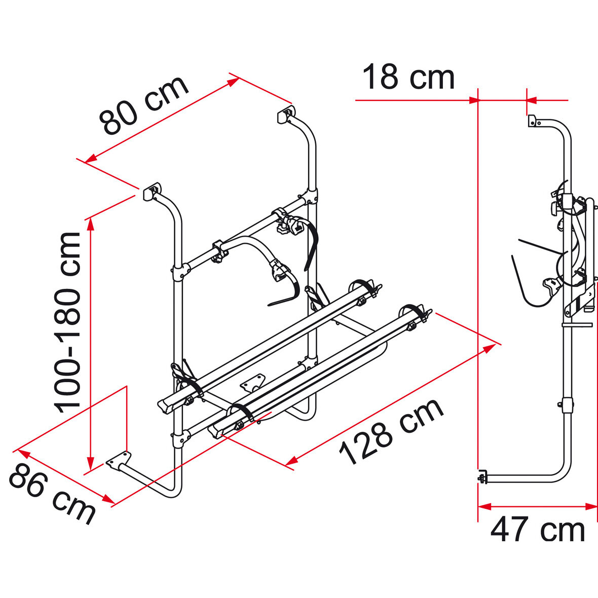 Passend für Modelle von Bürstner, Chateau und anderen Marken mit unteren Montagepunkten. Die oberen und unteren Halterungen werden mit selbstschneidenden Schrauben befestigt. Serienmäßig mit 2 Rail Quick Pro Schienen für alle Fahrradmodelle. Höhenverstellbar: 100 – 180 cm