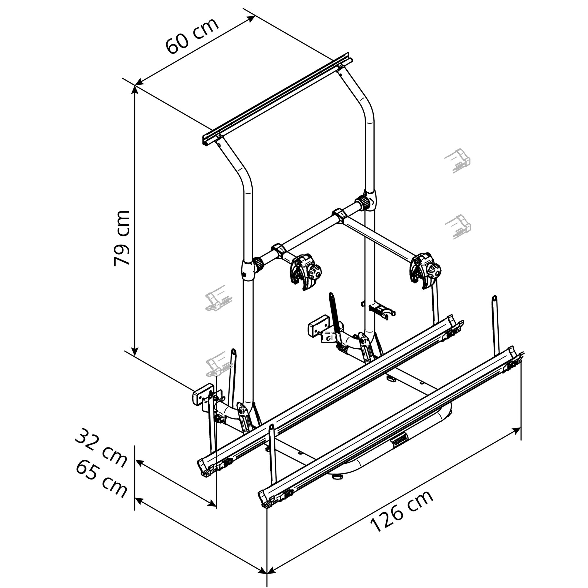 Fahrradträger für 2 Fahrräder mit einer Tragfähigkeit von 50 kg. Passend für alle Hobby-Wohnwagen der Baujahre 2004 bis 2014/06. Du kannst den Träger mit dem Erweiterungs-Set, Art.-Nr. 89 422 (siehe Katalogseite 222), auf 3 Fahrräder erweitern.