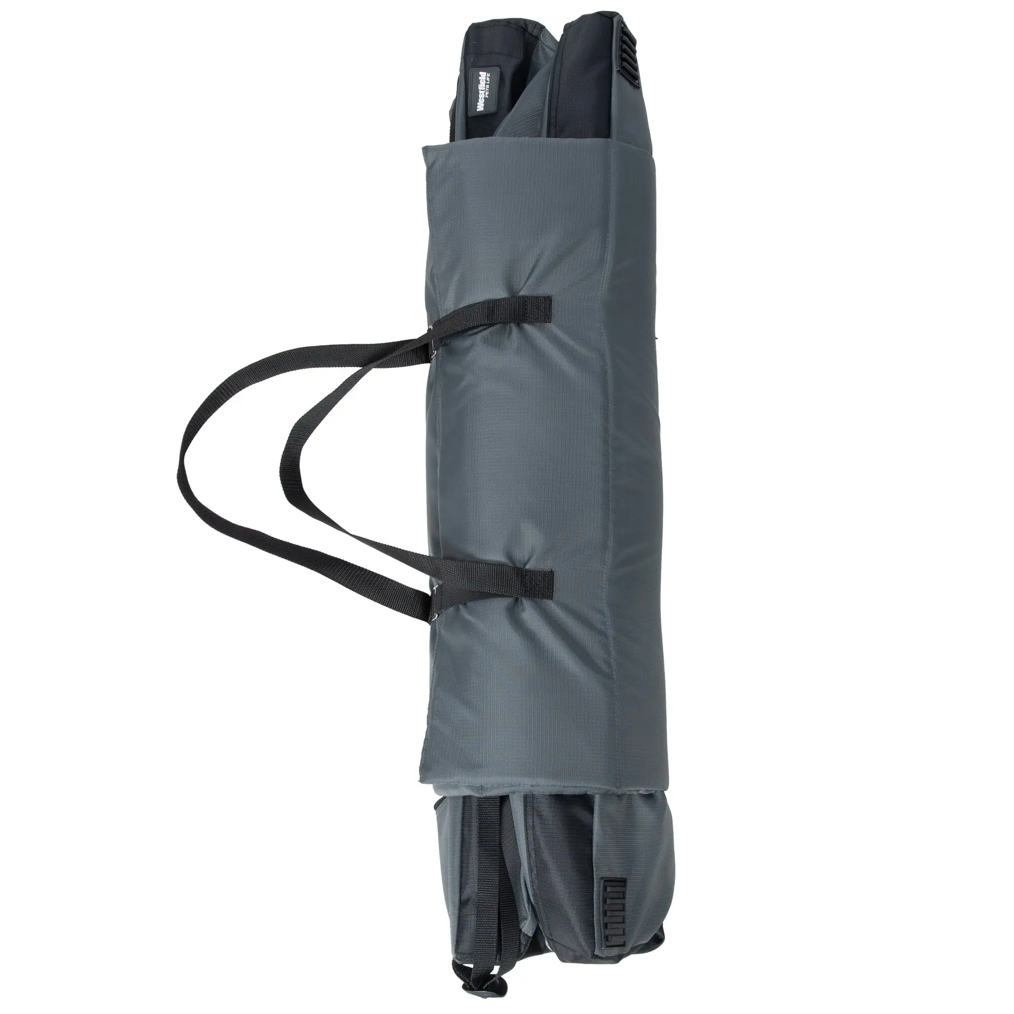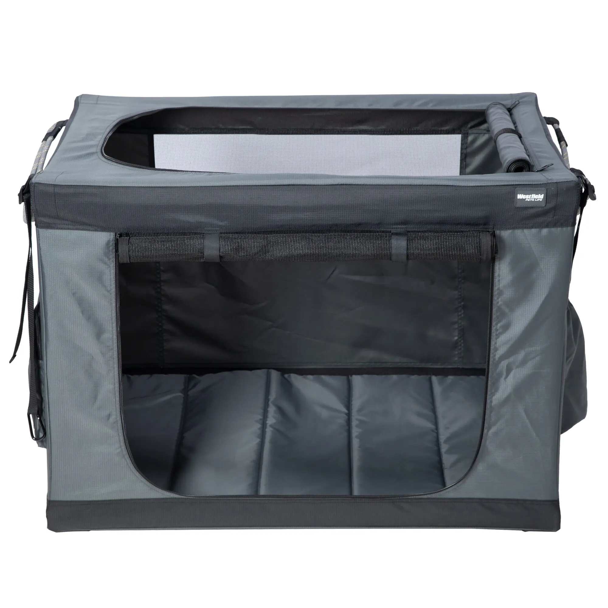 Die seitlich faltbare Tier-Transportbox aus pulverbeschichtetem Stahlrahmen in Dunkelgrau bietet kleinen und großen Hunden einen sicheren, komfortablen Rückzugsort mit zwei atmungsaktiven Mesh-Türen vorne und oben für Licht, Luftzirkulation und Ausblick; seitliche, einklappbare Stahl-Tragehilfen ermöglichen einfaches Tragen, der platzsparende Faltmechanismus erleichtert Lagerung und Transport im Auto, wo Sicherheitsleinen die Box fixieren.