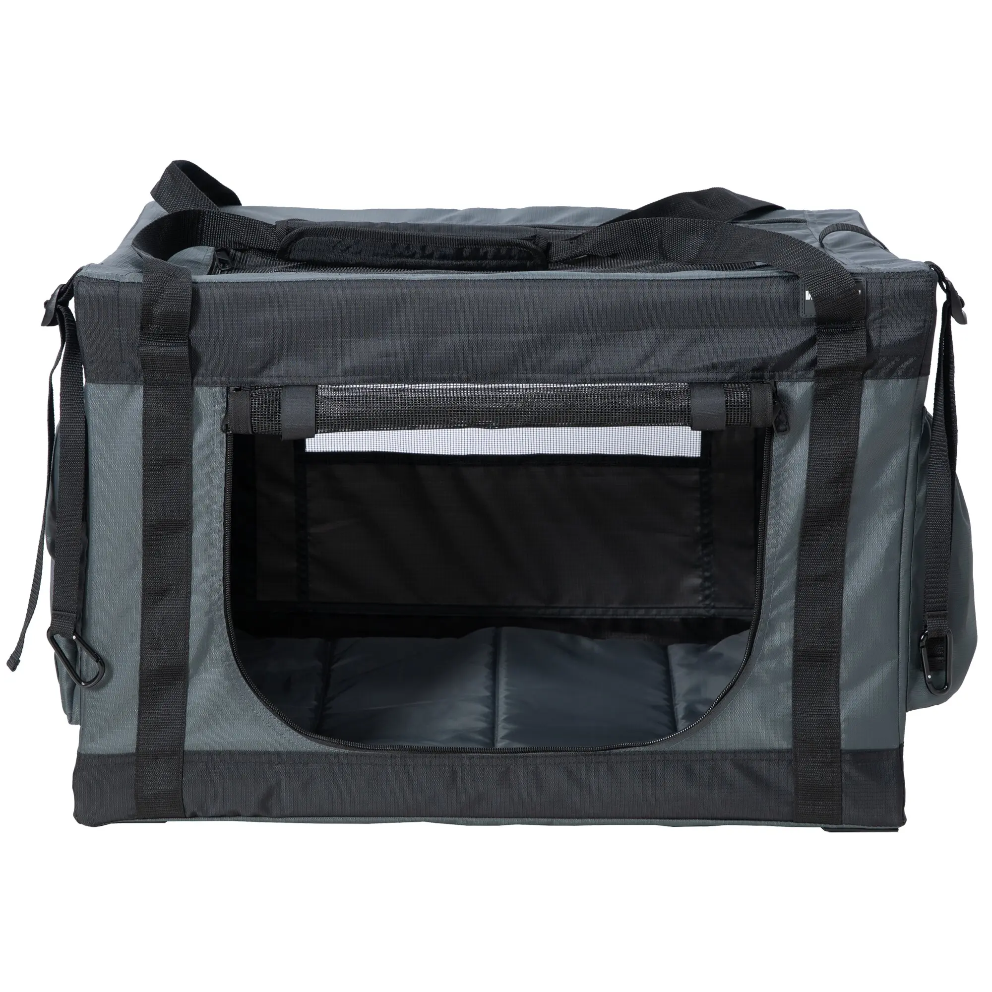 Die seitlich faltbare Tier-Transportbox aus pulverbeschichtetem Stahlrahmen in Dunkelgrau bietet kleinen und großen Hunden einen sicheren, komfortablen Rückzugsort mit zwei atmungsaktiven Mesh-Türen vorne und oben für Licht, Luftzirkulation und Ausblick; seitliche, einklappbare Stahl-Tragehilfen ermöglichen einfaches Tragen, der platzsparende Faltmechanismus erleichtert Lagerung und Transport im Auto, wo Sicherheitsleinen die Box fixieren.