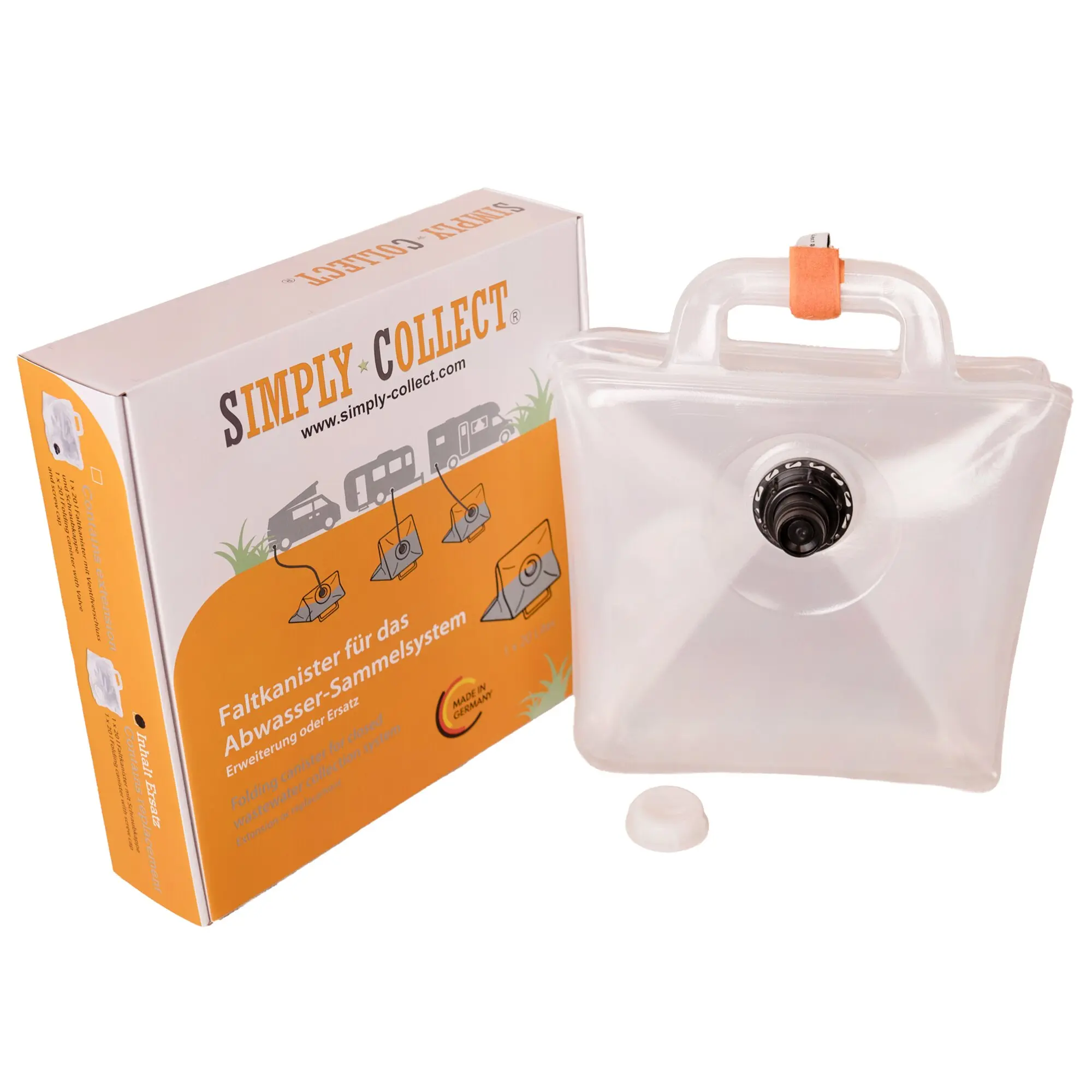 20 l Ersatz-Faltkanister mit Ventilverschluss für beide Simply Collect Grauwasser-Sammelsysteme. Platzsparend verstaubar, dank Doppelgriff leicht zu transportieren und für eine saubere, kontrollierte Entleerung geeignet.