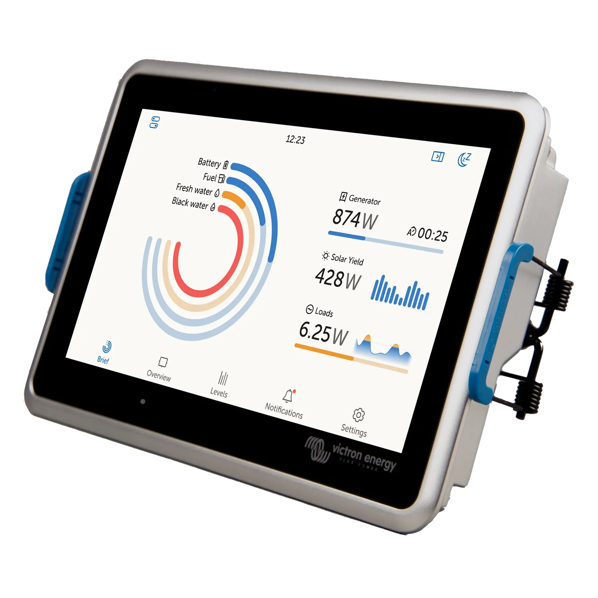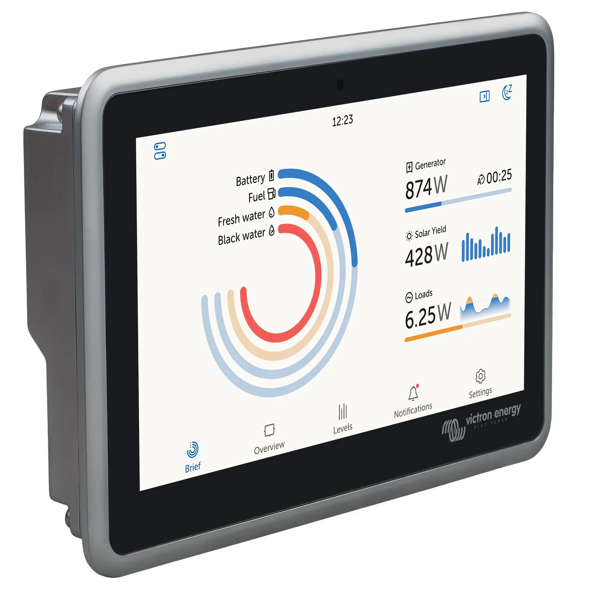 Ekrano GX ist das Herzstück Ihrer Energieanlage. Alle anderen Victron Systemkomponenten – wie Wechselrichter/Ladegeräte, Solarladegeräte, Batterien usw. – sind daran angeschlossen. Das Ekrano GX sorgt dafür, dass alles harmonisch miteinander arbeitet.