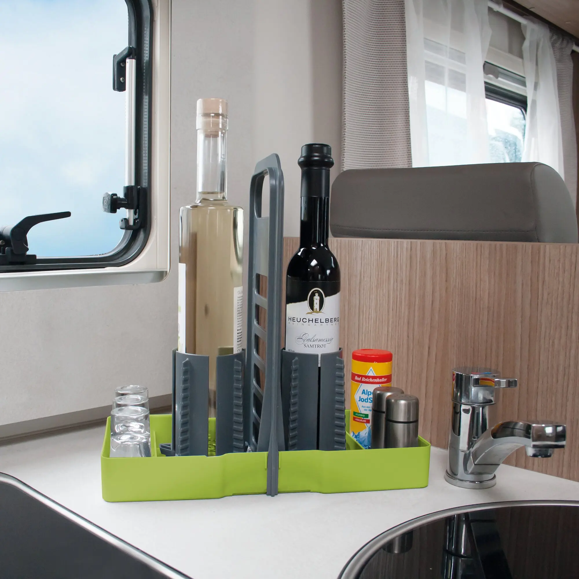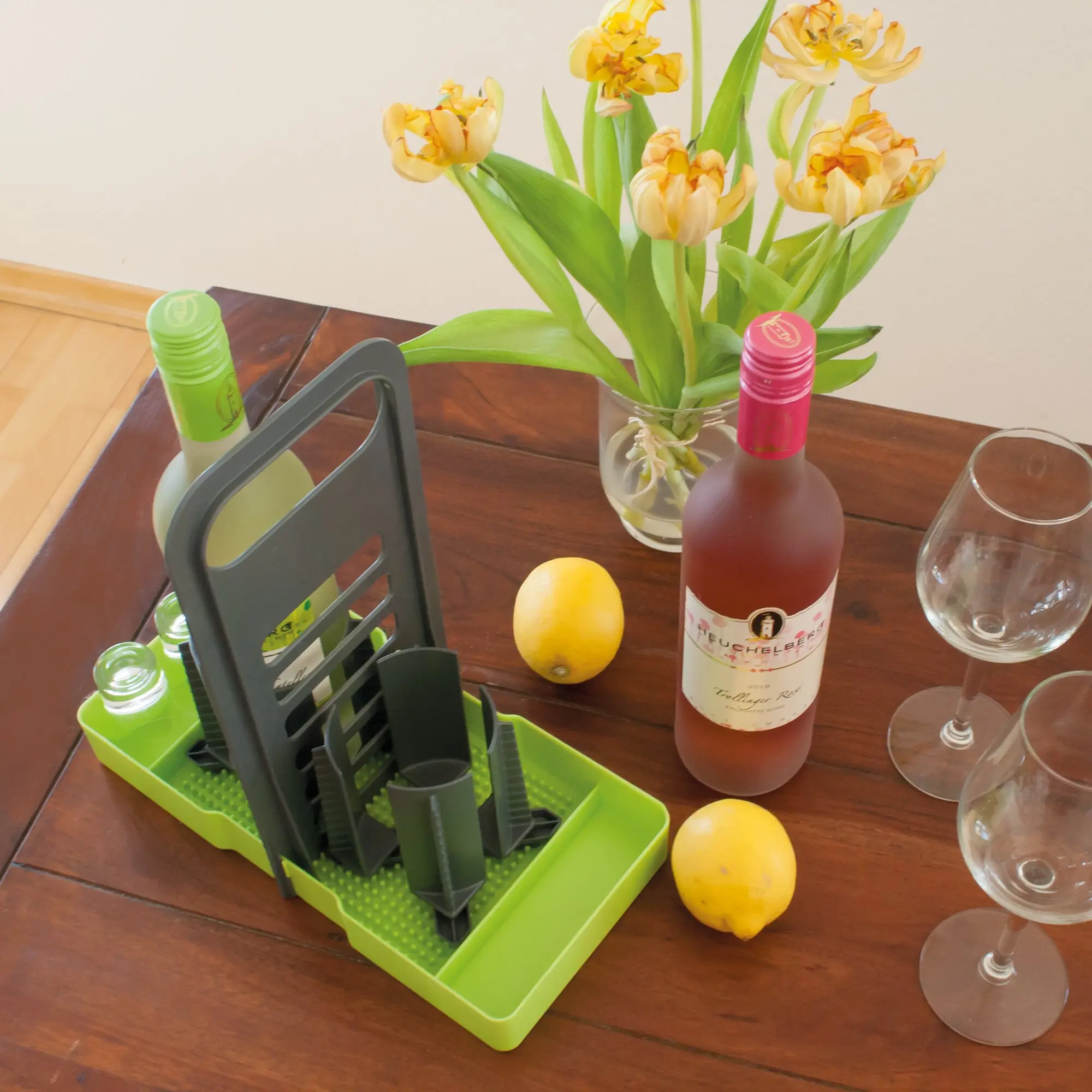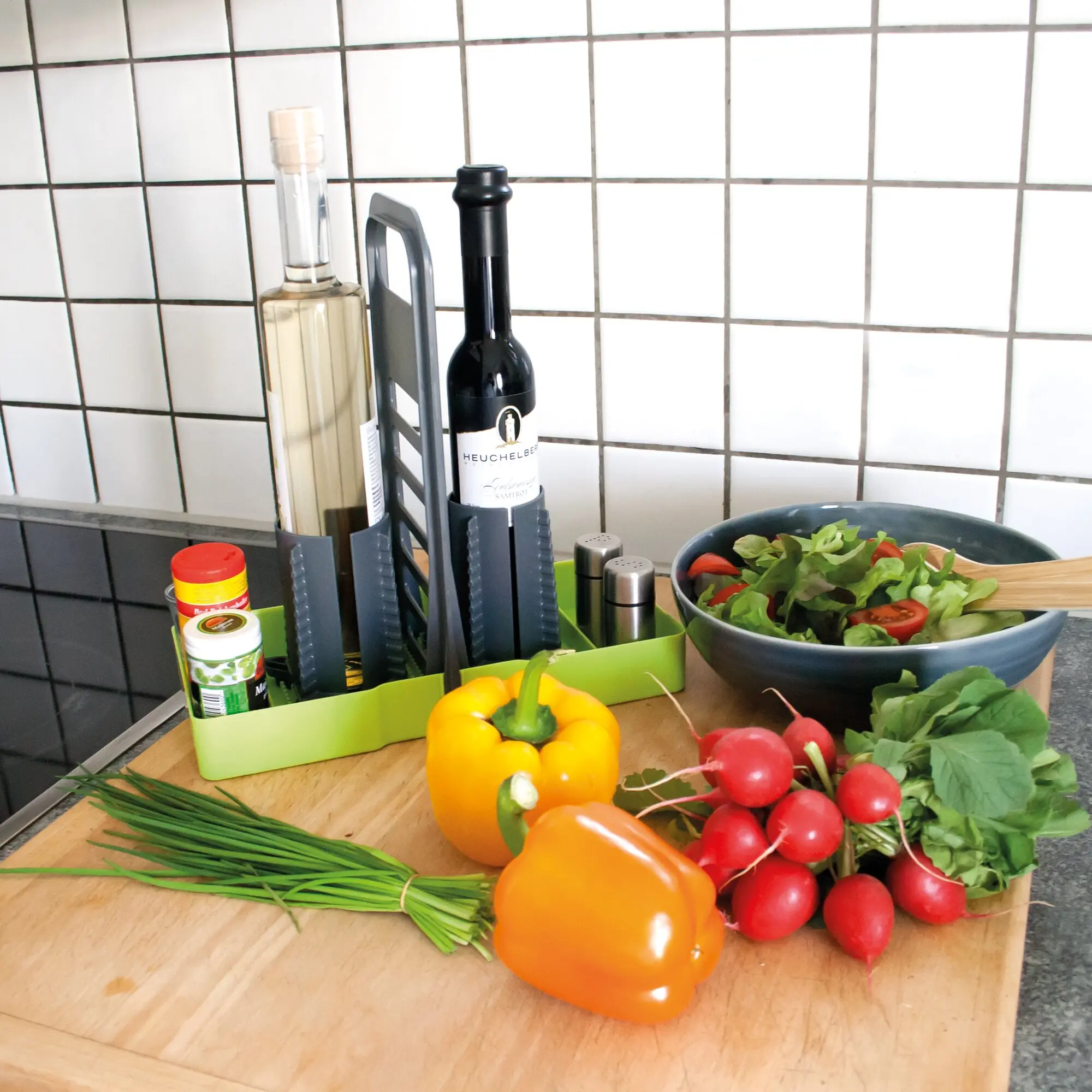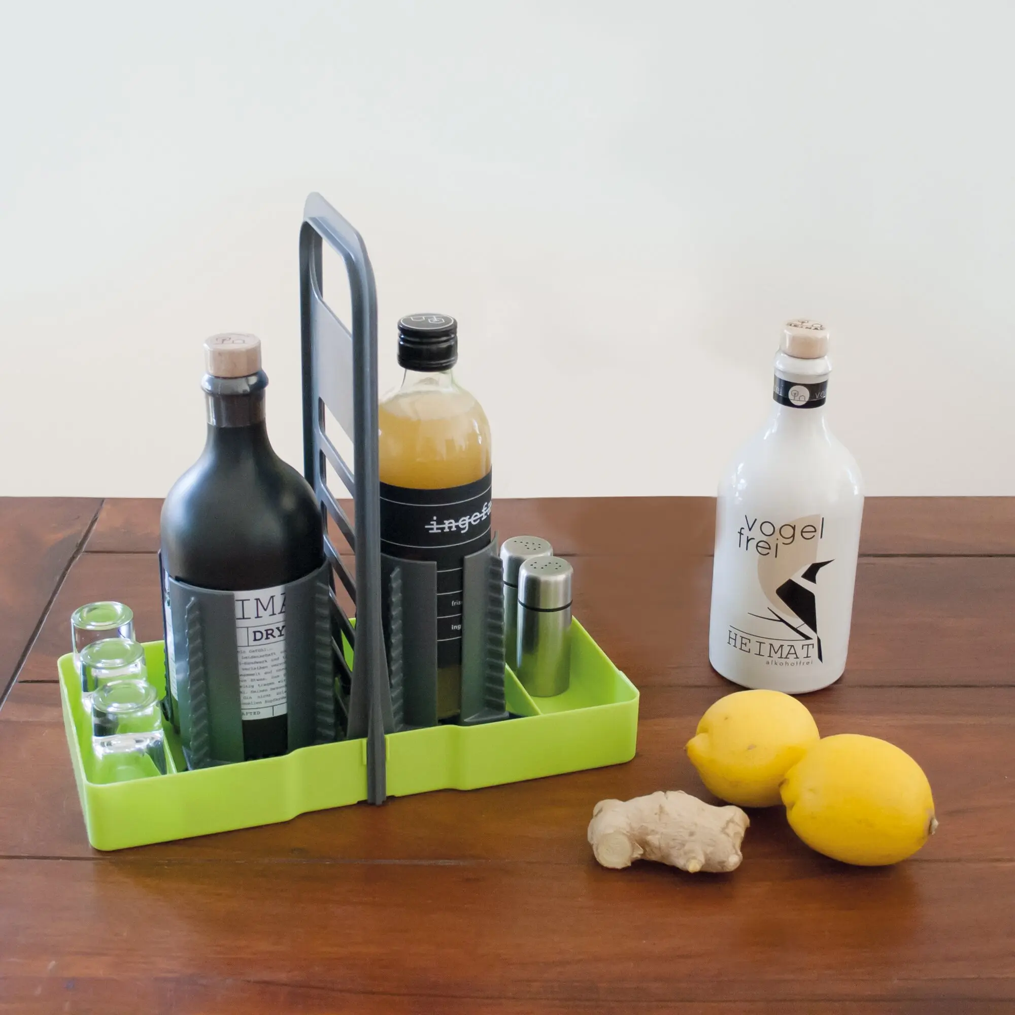 Multi Tray OELE ist bestens geeignet für den mobilen Einsatz. Sicheres und tropffreies Transportieren von Essig und Öl. Die Auffangwanne mit erhöhtem Rand verhindert das Auslaufen von Flüssigkeiten (z. B. Essig/Öl, Liköre). Praktischer Tragehenkel. Das robuste und formstabile Material sorgt für sicheren Halt. Spülmaschinenfest. Variable Steckmöglichkeiten innerhalb der Noppenplatte. STEKK-Noppen-Prinzip. Einfach die STEKK-Halter auf die Noppenplatte stecken. Für viele Flaschengrößen geeignet.