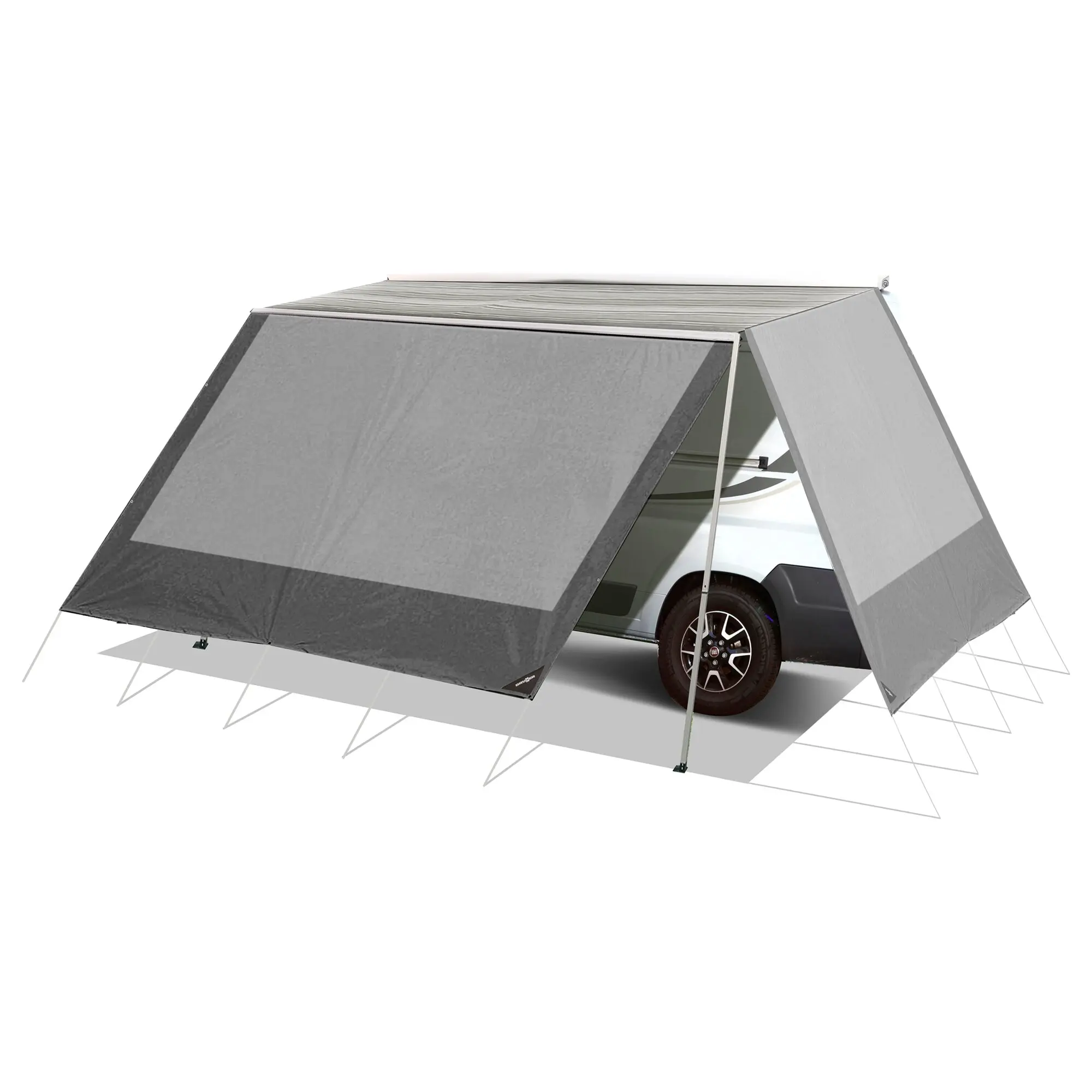 Praktische, schattenspendende Vorder- und Seitenwände, die Ihre Rollmarkise perfekt ergänzen. Hergestellt aus 2Mesh-Gewebe und mit großer Liebe zum Detail, sind diese robusten und zuverlässigen Accessoires die ideale Lösung, um Ihr Outdoor-Erlebnis zu verbessern. Die Vorder- und Seitenwände bestehen aus hochwertigen Materialien und bieten eine außergewöhnliche Langlebigkeit, um den Elementen Jahr für Jahr standzuhalten. Zusätzlich verfügen alle Belvedèr-Paneele über eine wasserdichte Abdeckung, die aufgerollt und bei Nichtgebrauch gesichert werden kann. Mit ihrem eleganten und professionellen Erscheinungsbild fügen sie sich nahtlos in Ihr bestehendes Markisensystem ein und verleihen Ihrem Außenbereich ein einheitliches und stilvolles Aussehen. Die Vorderwand ist für Markisen aller namhaften Hersteller geeignet.