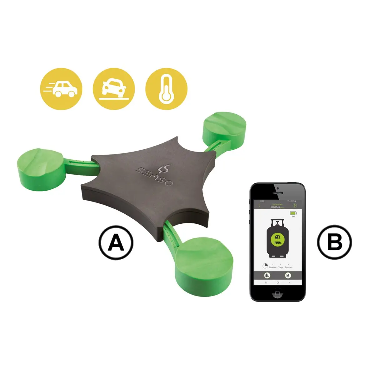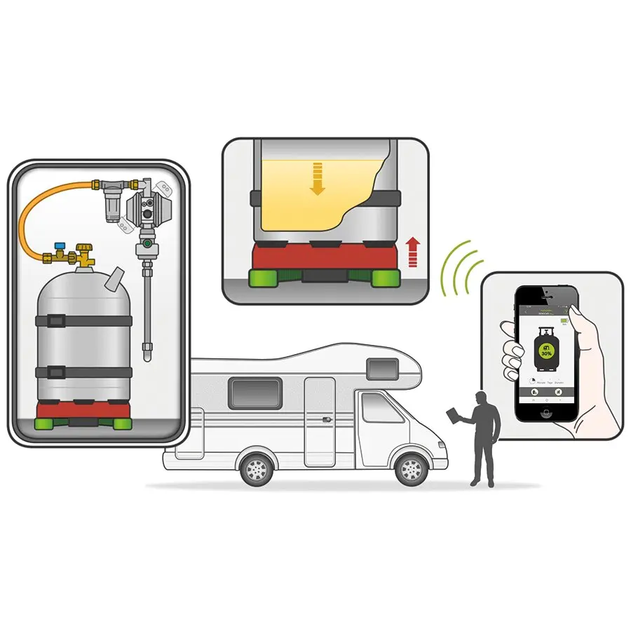 Mit Bluetooth-Fernübertragung der Mess- und Meldedaten an ein Smartphone oder Tablet. Der Füllstandsmesser Senso4s PLUS misst das Gewicht der Gasflasche und übermittelt diesen Wert per Bluetooth an die App. Diese errechnet automatisch den Inhalt und erstellt eine Verbrauchsprognose.