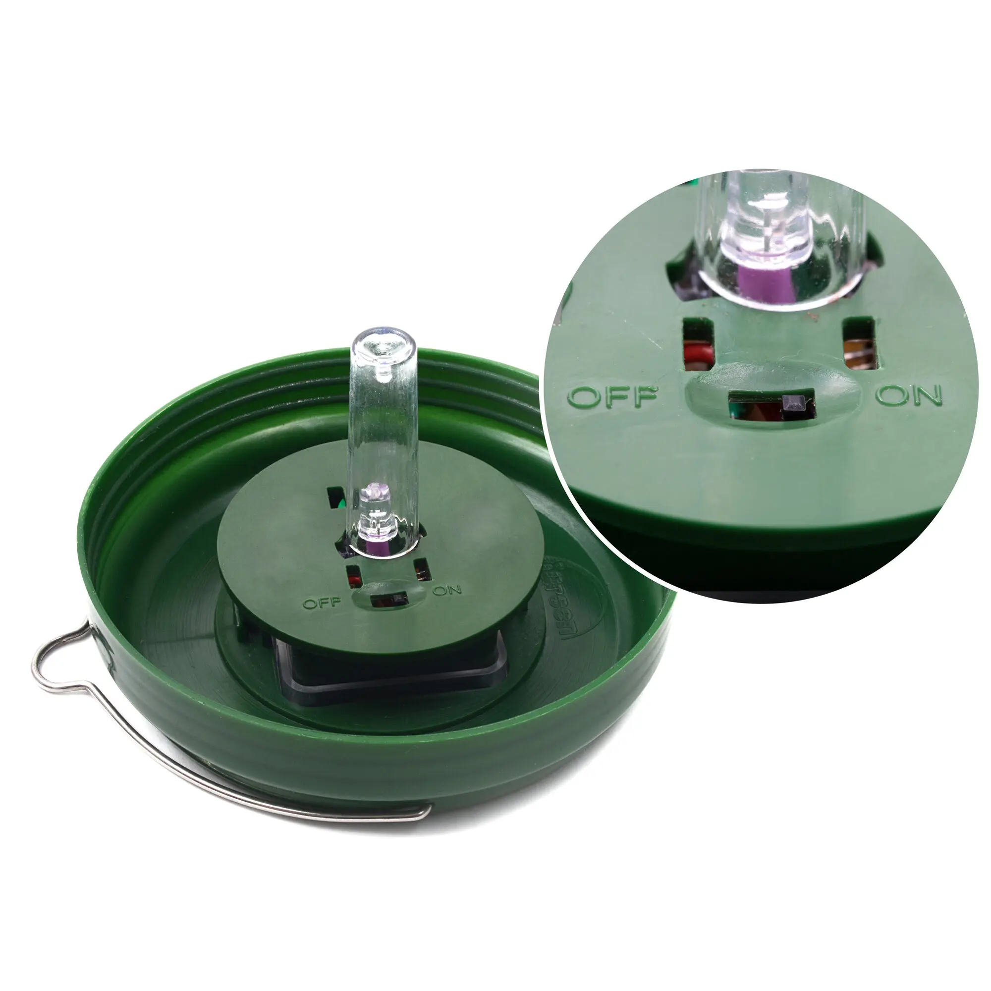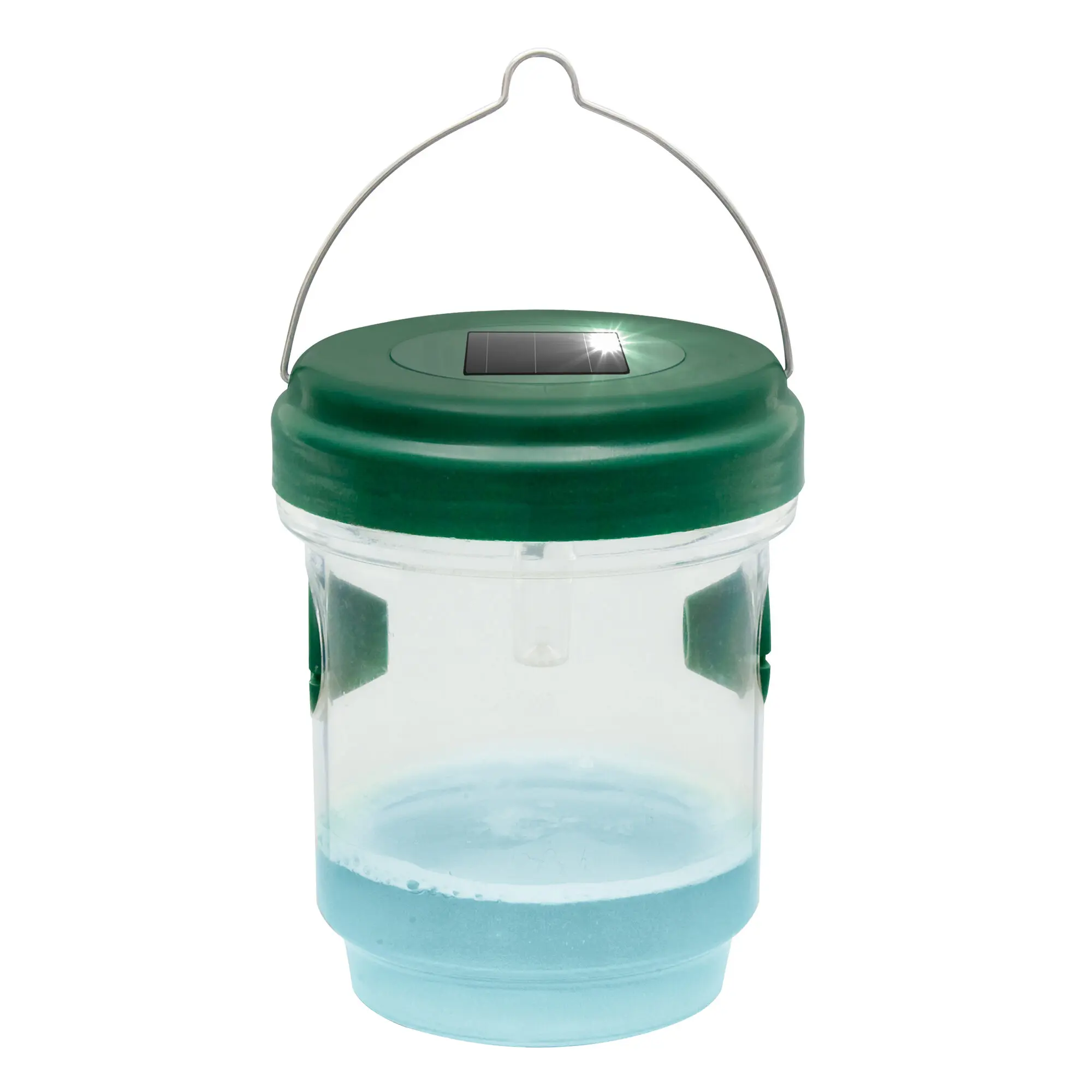 Flüssigkeit zieht tagsüber Wespen an. LED-Schimmereffekt zieht nachts Mücken an.