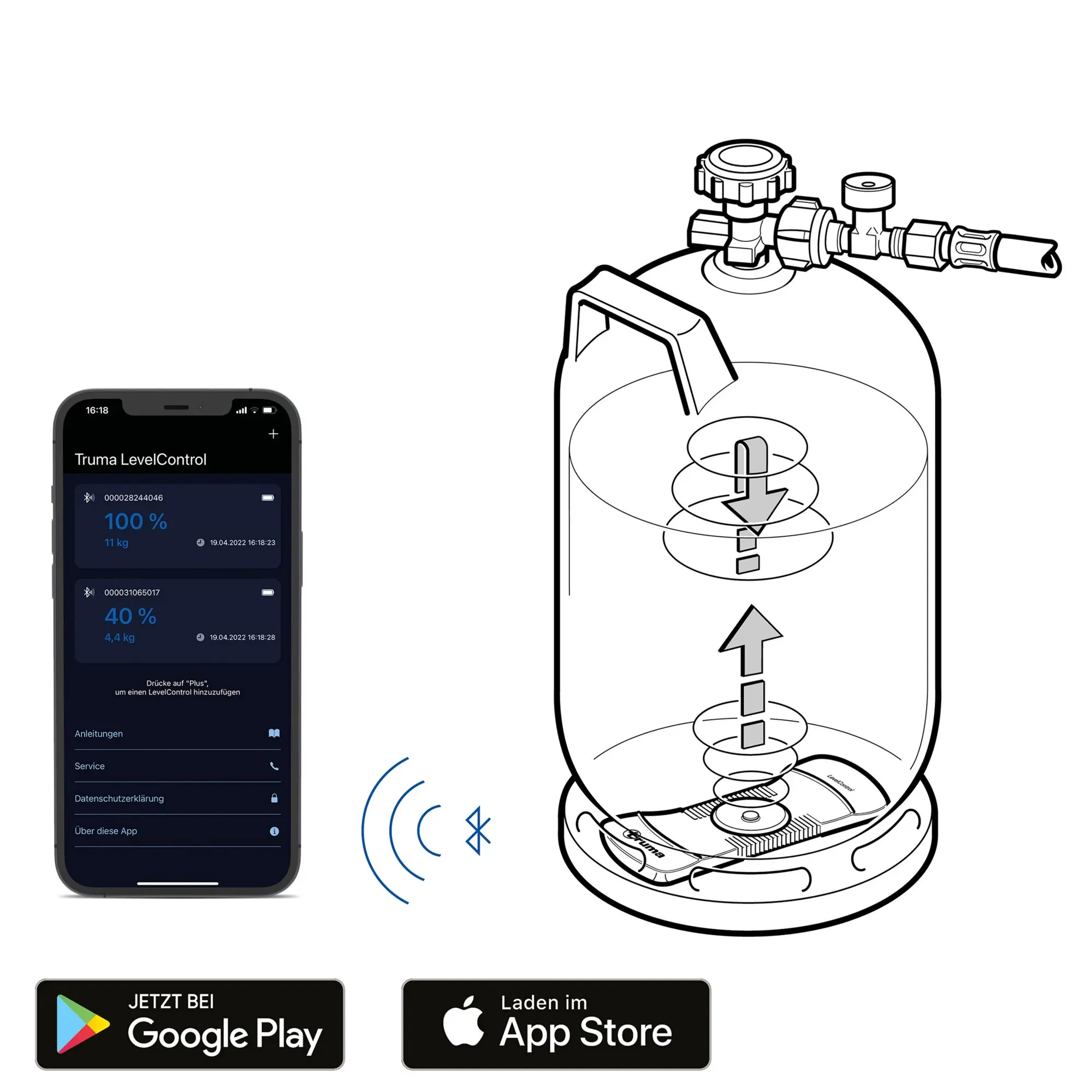 Mit der Truma App kannst Du dir den Füllstand bequem von Deinem Smartphone aus ansehen. Das funktioniert sowohl im Fahrzeug oder in der Nähe per Bluetooth als auch per SMS von unterwegs – und zwar so präzise wie nie zuvor. Solltest Du das innovative iNet System bereits in Deinem Wohnwagen integriert haben, kannst Du es durch die Level Control problemlos erweitern. Für die Verbindung mit der Truma Gasregelanlage ist das Gerät leider nicht geeignet. Befinden sich zwei Gasflaschen im Fahrzeug, kannst Du zwei Truma Level Control Füllstandsmesser parallel verwenden. Die Truma App zeigt dann den Füllstand von beiden Flaschen an.