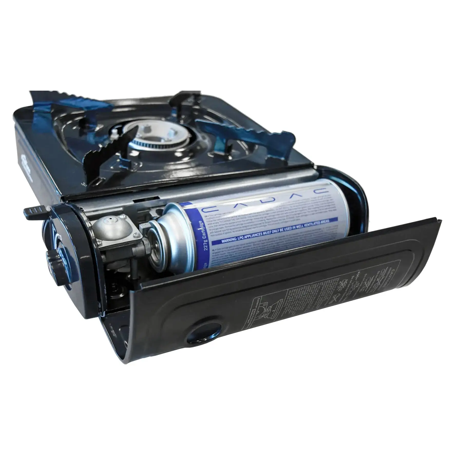 Die CADAC Gaskartusche mit 227g Butangasgemisch verfügt über ein Ventil und eine Schutzkappe. Die Schraubkartusche ist mit einem SSN-29 Gewinde ausgestattet und wird horizontal in das zu betreibende Gerät eingeschraubt. Dieser Vorgang ist dank des Push & Turn-Systems sehr einfach und benutzerfreundlich.