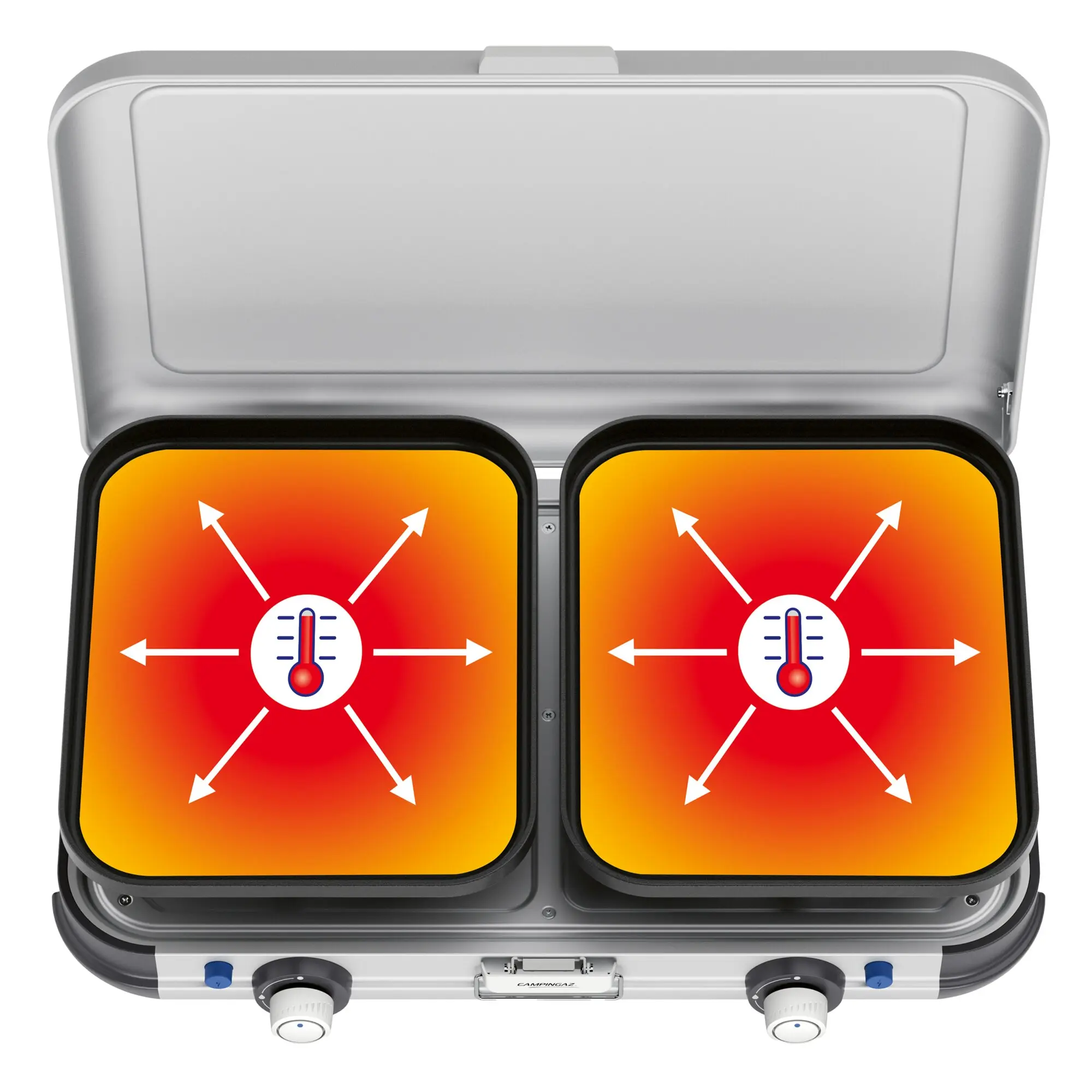 Der Camping Kitchen™ 2 GRILL & GO ist ein vielseitiger Koch- und Grillbegleiter mit einem 2-Flammen-Herd, abnehmbarem Grillrost und Planchaplatte. Ideal für Outdoor-Abenteuer oder gesellige Treffen zu Hause. Topfträger ø 20 cm. Inkl. Transporttasche.