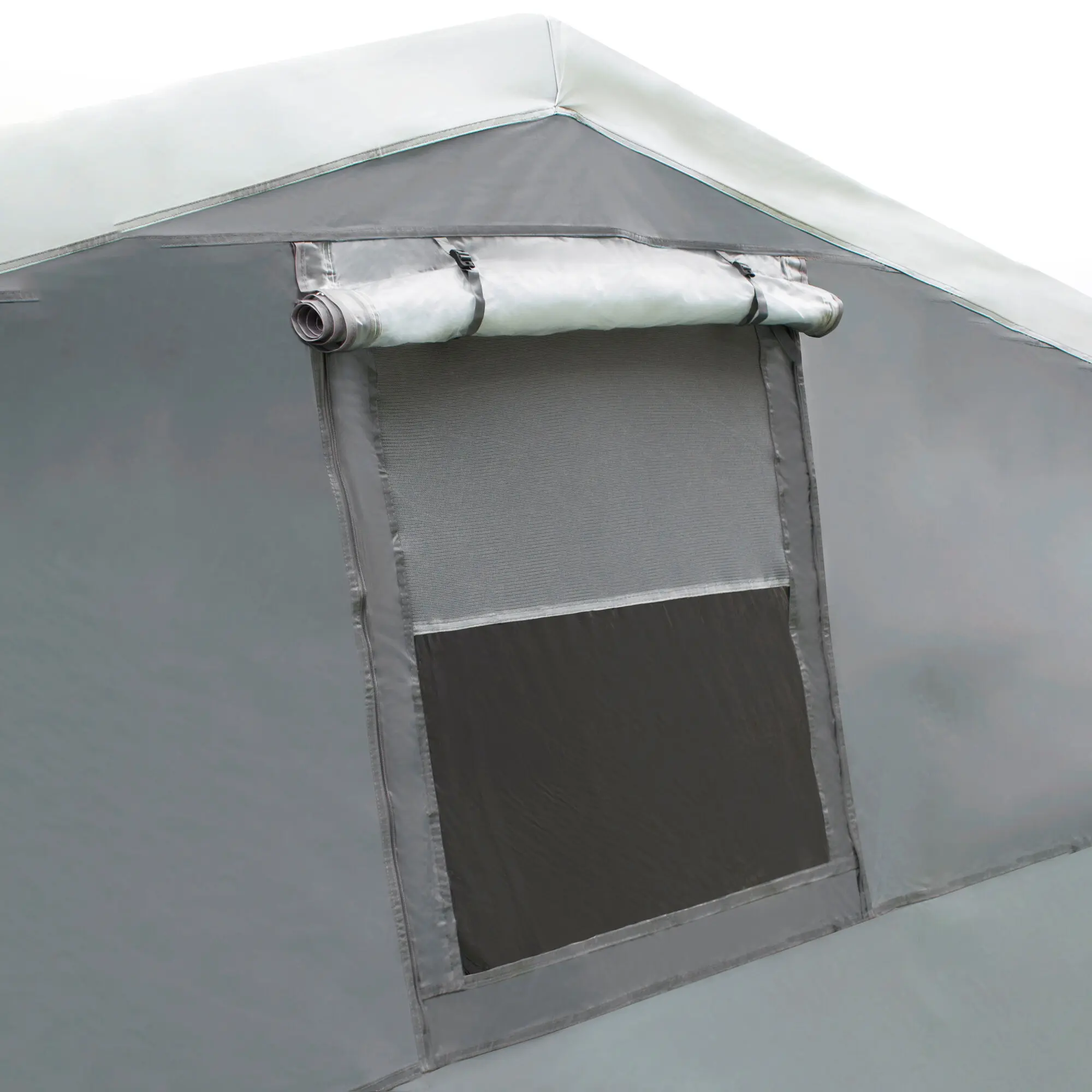 Ein Muss für jeden Dauercamper. Große Beständigkeit gegen Umwelteinflüsse. Einfacher Aufbau. Die Vorderwand (hochrollbar) ist mit zwei senkrechten, abgedeckten Reißverschlüssen ausgestattet. Mit Sturmabspannschlaufen und Belüftungsfenster. Material: Polyester mit PVC-Beschichtung. Gestänge: ø 22 mm Stahl.