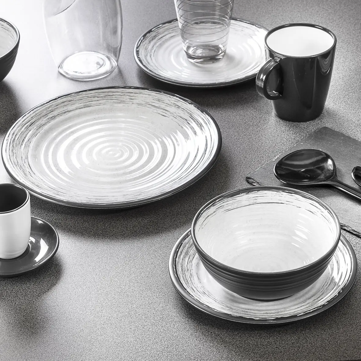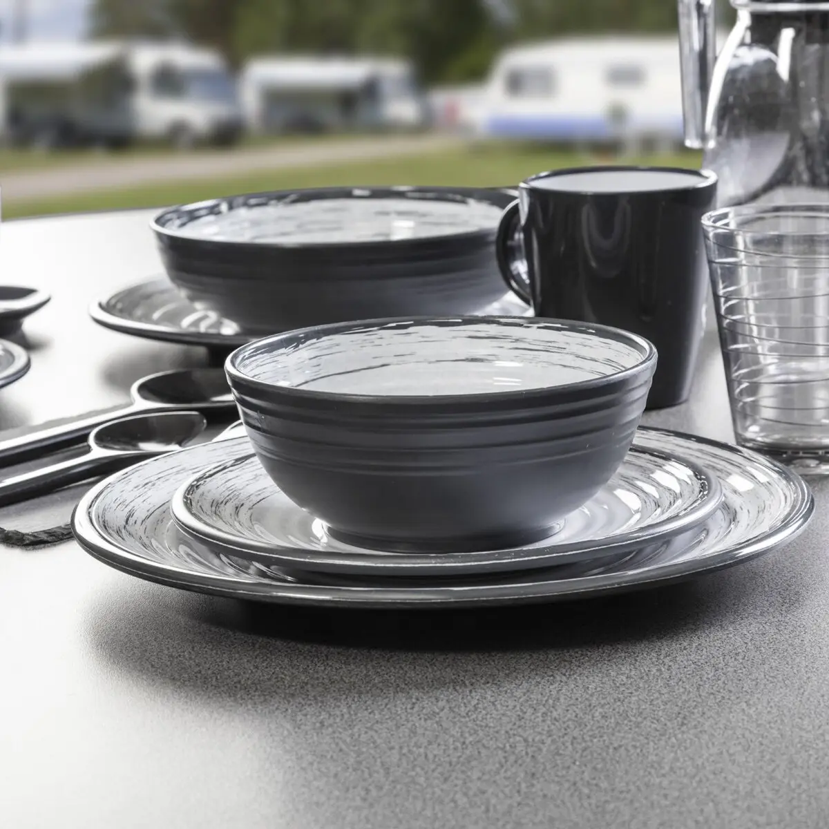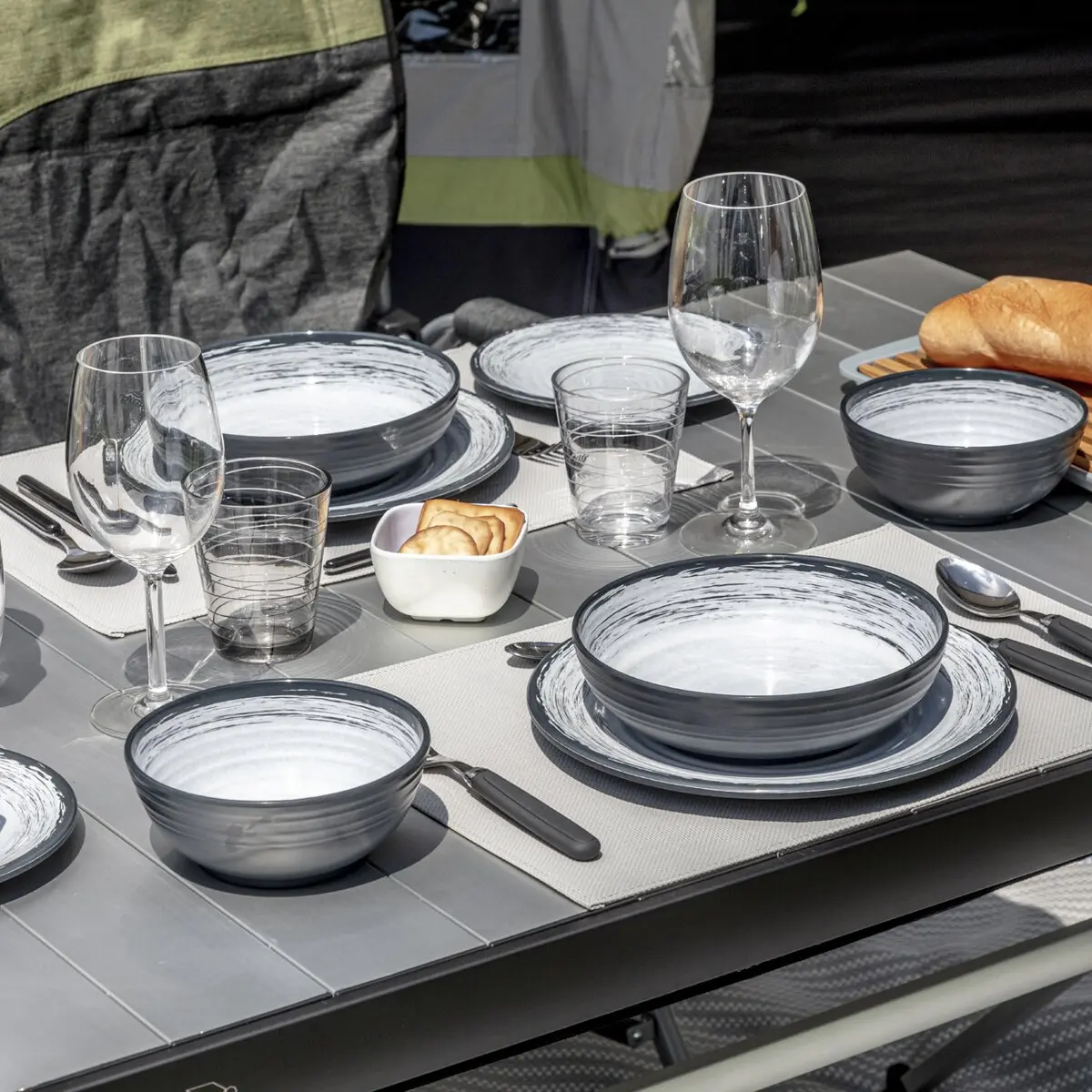 Ob es der Teller Pasta Pomodore in den Bergen Italiens ist, die bunte Paella an der spanischen Küste oder die Tasse Kaffee beim Picknick in den blühenden Tulpenfeldern der Niederlande – das GRANADA Melamin Geschirr Set lässt deine kulinarischen Outdoor-Erlebnisse zu einem stilvollen Highlight werden. Das zeitlose Geschirr Set in kontrastreichen Grautönen mit einer leicht rustikalen Struktur kann die Gerichte deiner Reise sowohl nostalgisch als auch modern in Szene setzen – so steht schönen Erinnerungsfotos für das nächste Campingabenteuer nichts mehr im Wege. Durch die porzellanähnliche Optik des Melamin Geschirrs ist ein dekorativer Frühstückstisch bei Sonnenaufgang im Hinterland umgehend gedeckt, sodass auch den größten Stubenhocker bei diesem Anblick das Fernweh überkommt. Auch durch seine Langlebigkeit eignet sich das robuste Geschirrset besonders gut als neuer Begleiter für unvergessliche Mahlzeiten in der Natur.