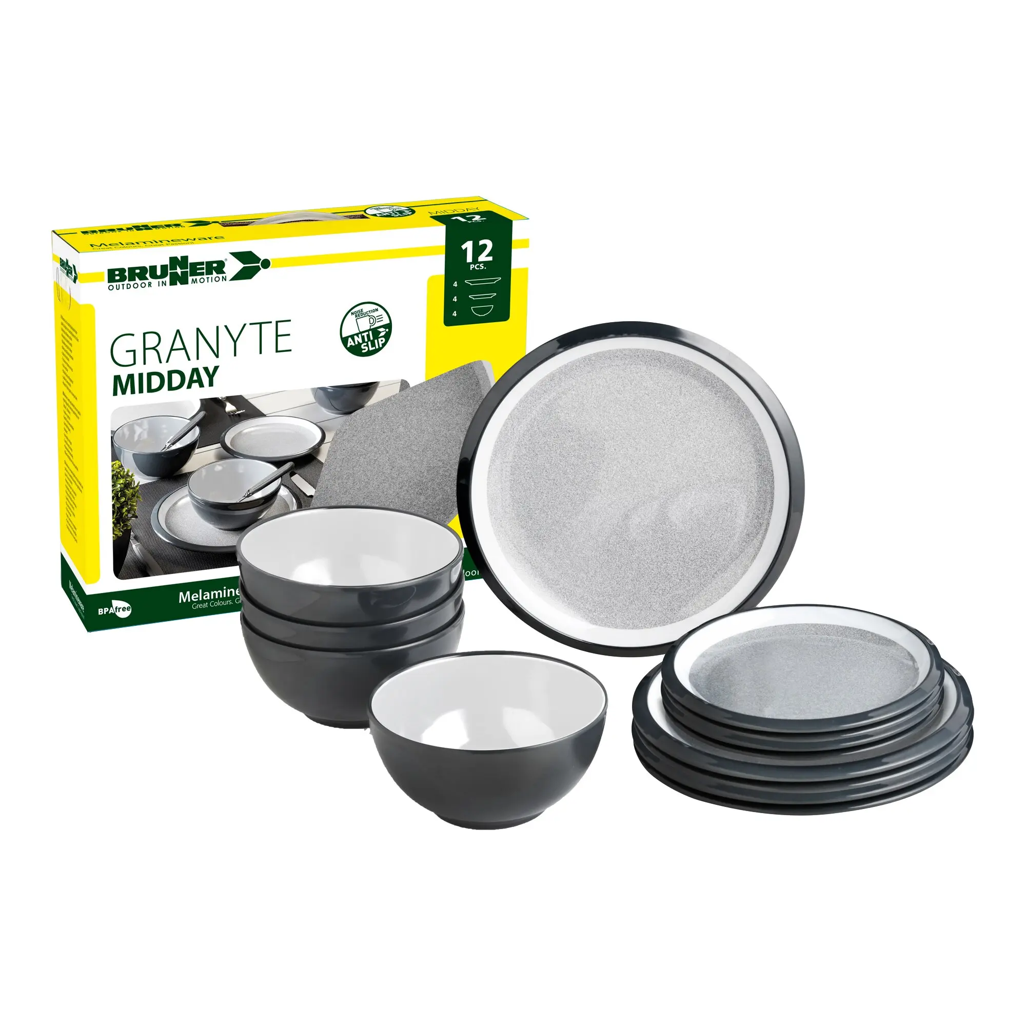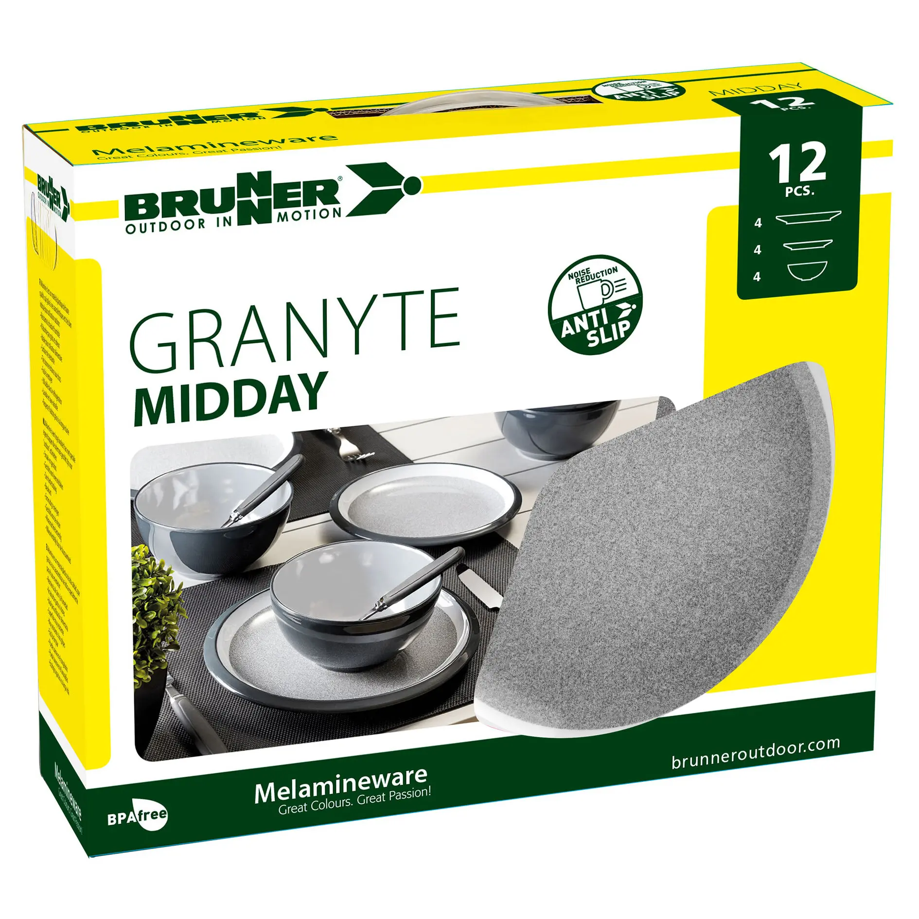 Geschirr im klassischen Design. Die Serie ist mit Anti-Slip-Ring ausgestattet und daher bestens für den Einsatz in Freizeitfahrzeugen geeignet.