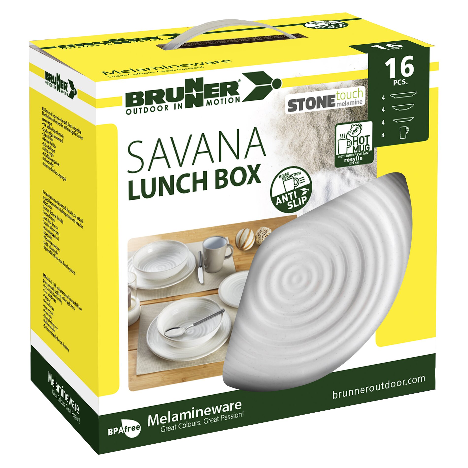 | Zusatzinformation: | Das 16-tlg. Set enthält:4 Essteller ø 26 cm4 Suppenteller ø 21 cm4 Dessertteller ø 21 cm4 Henkelbecher Resylin 300 ml |
