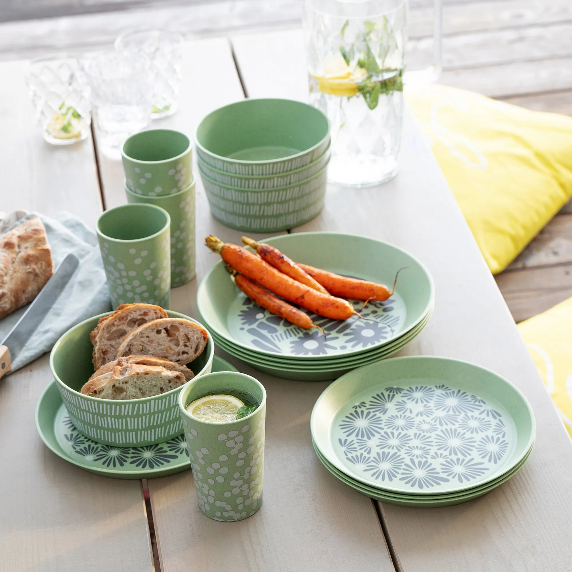 Das Geschirrset Blomster ist leicht, robust und melaminfrei – ideal für Camping, Picknick oder Alltag. Teller, Schalen und Becher sind spülmaschinen- und mikrowellengeeignet, stapelbar und CO₂-neutral produziert.