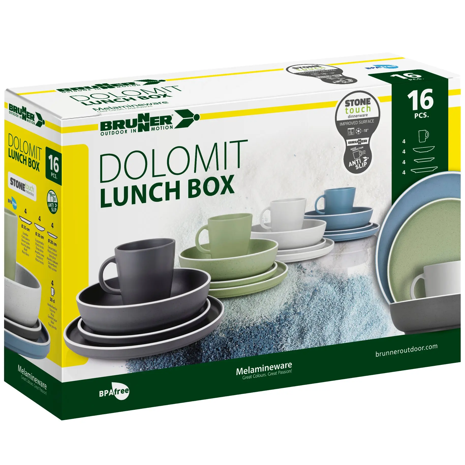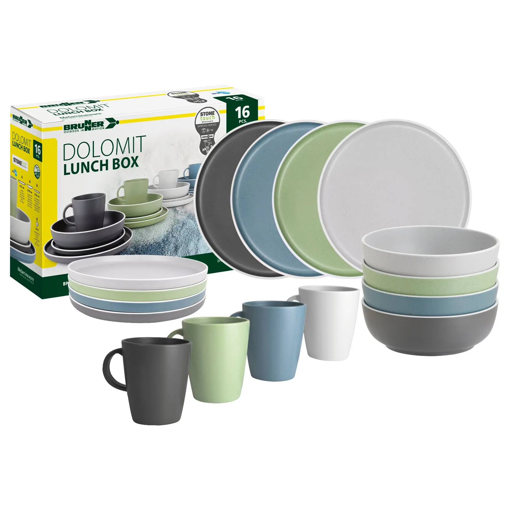 | Zusatzinformation: | Das 16-tlg. Set enthält:4 Essteller ø 25 cm4 Suppenteller ø 20 cm4 Dessertteller ø 20 cm4 Henkelbecher 300 ml |