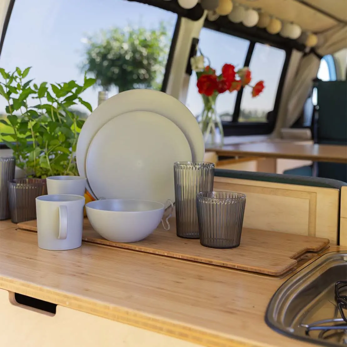 Das Geschirrset Renew besteht aus rPET und ist vollständig recycelbar. Es ist leicht, robust, spülmaschinenfest, mikrowellengeeignet und BPA-frei. Hitzebeständig bis 140 °C – ideal für Camping, Alltag und unterwegs. In Kombination mit den Nomad-Gläsern 550/843 und 550/844 entsteht ein stilvoller, umweltfreundlicher Tisch.