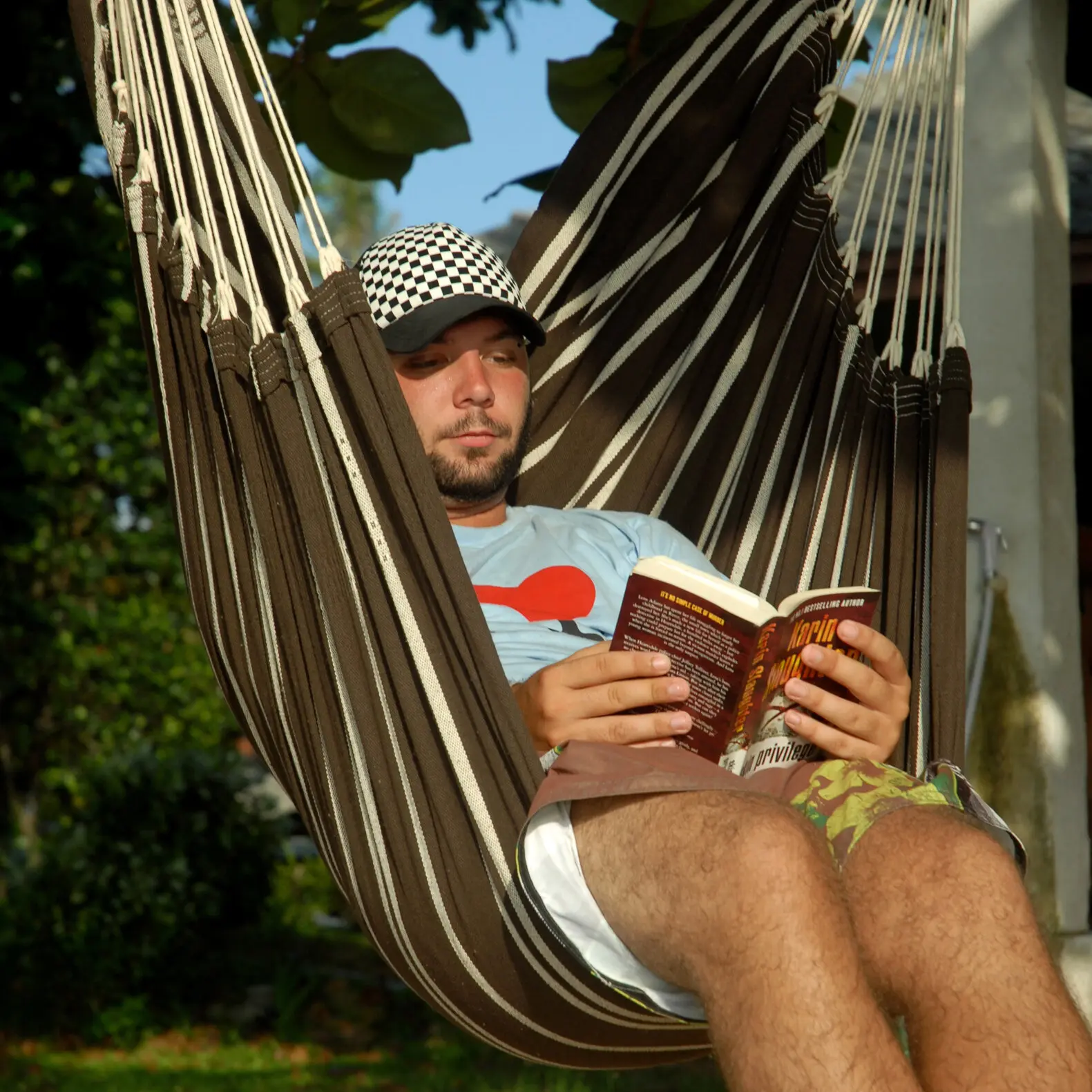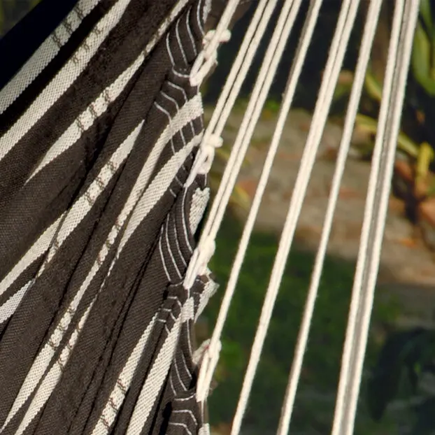 Der kuschelweiche Stoff aus 85 % Baumwolle und 15 % Polyester wird in sorgfältiger Handarbeit in Brasilien gewebt und ist, wie alle brasilianischen Hängematten, besonders groß und bequem. Auch der Holzstab hat mit 1,10 m die richtige Länge, dass sich auch Sitzriesen bequem entspannen können. Das nur knapp 3 kg schwere Möbelstück ist überall mit einem Handgriff auf- oder abgehängt. Die dafür erforderliche Mindestraumhöhe ist ca. 2,20 m.