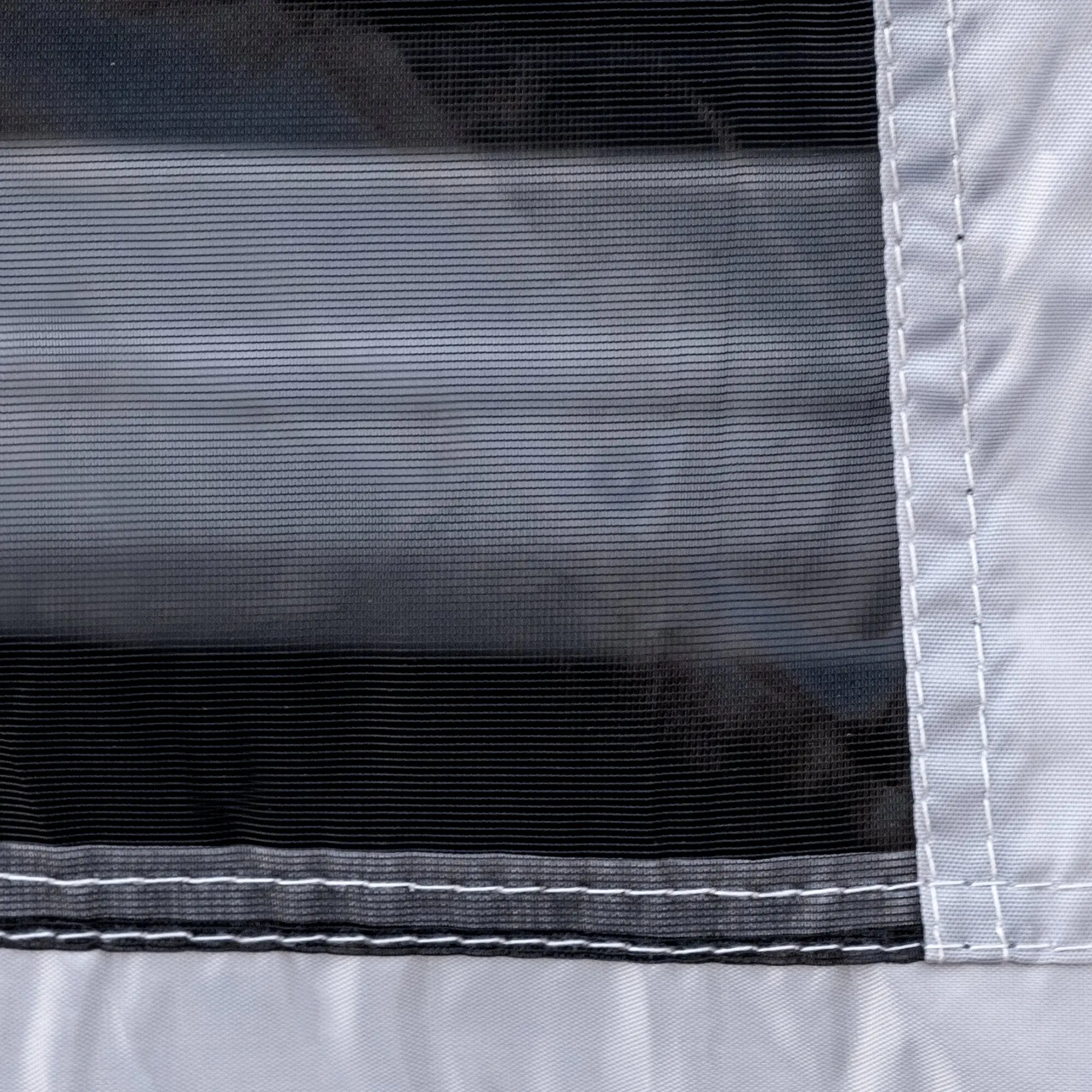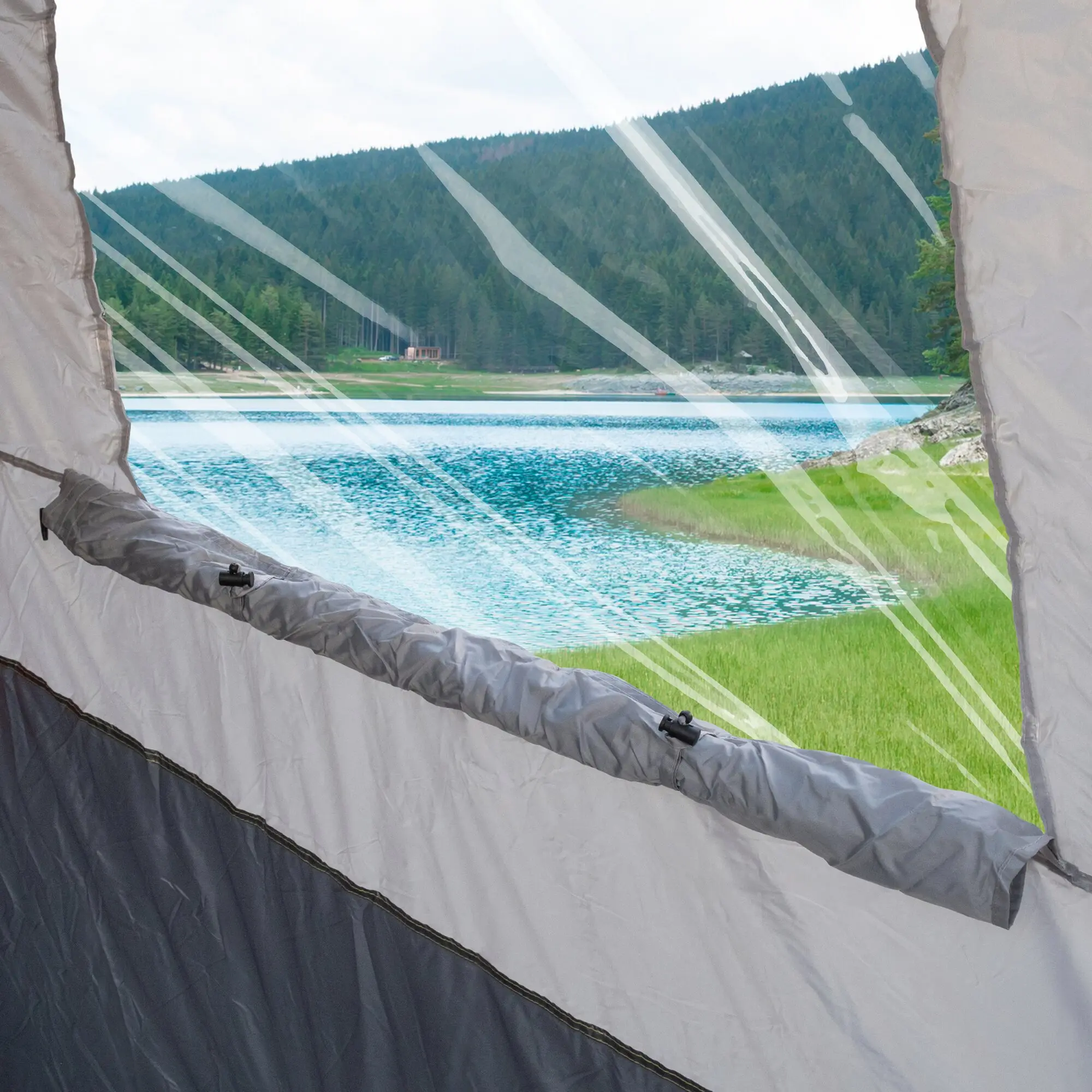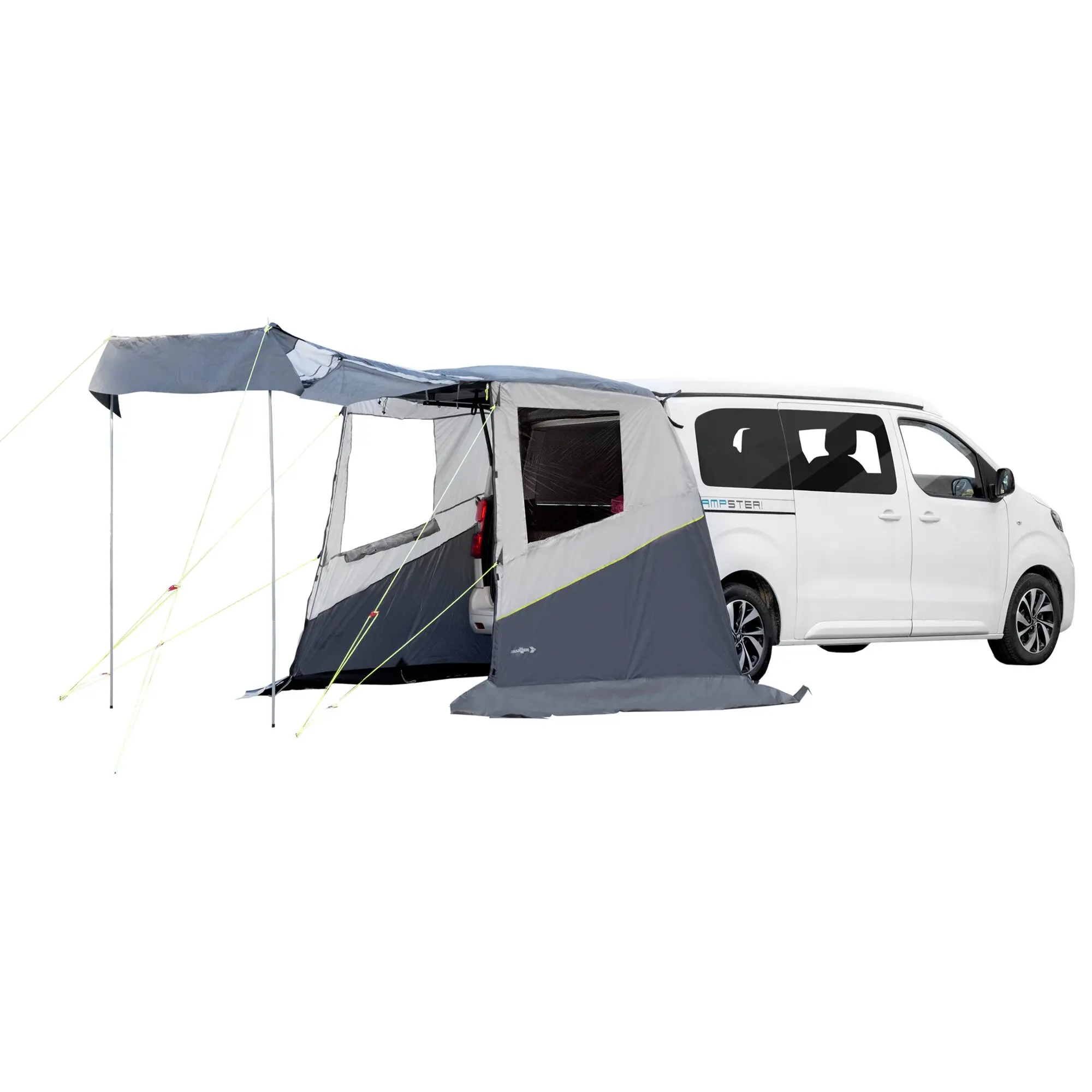 Das rahmenlose Heckklappenzelt passt an verschiedene baugleiche Fahrzeugmodelle: Peugeot Traveller, Citroën Spacetourer und Toyota Proace. Schnelle und einfache Montage ohne Werkzeug mit Magnetstreifen und Gurten. Sehr windstabil dank Abspanngurten. Der außenliegende Faulstreifen hält Regenwasser fern. Inkl. 30 cm Kunststoffheringen und Packtasche. Der Fahrradträger kann auf der Heckklappe montiert bleiben. Hochrollbare Vorderwand und Seitenwände mit Fenstern und Verdunkelung.