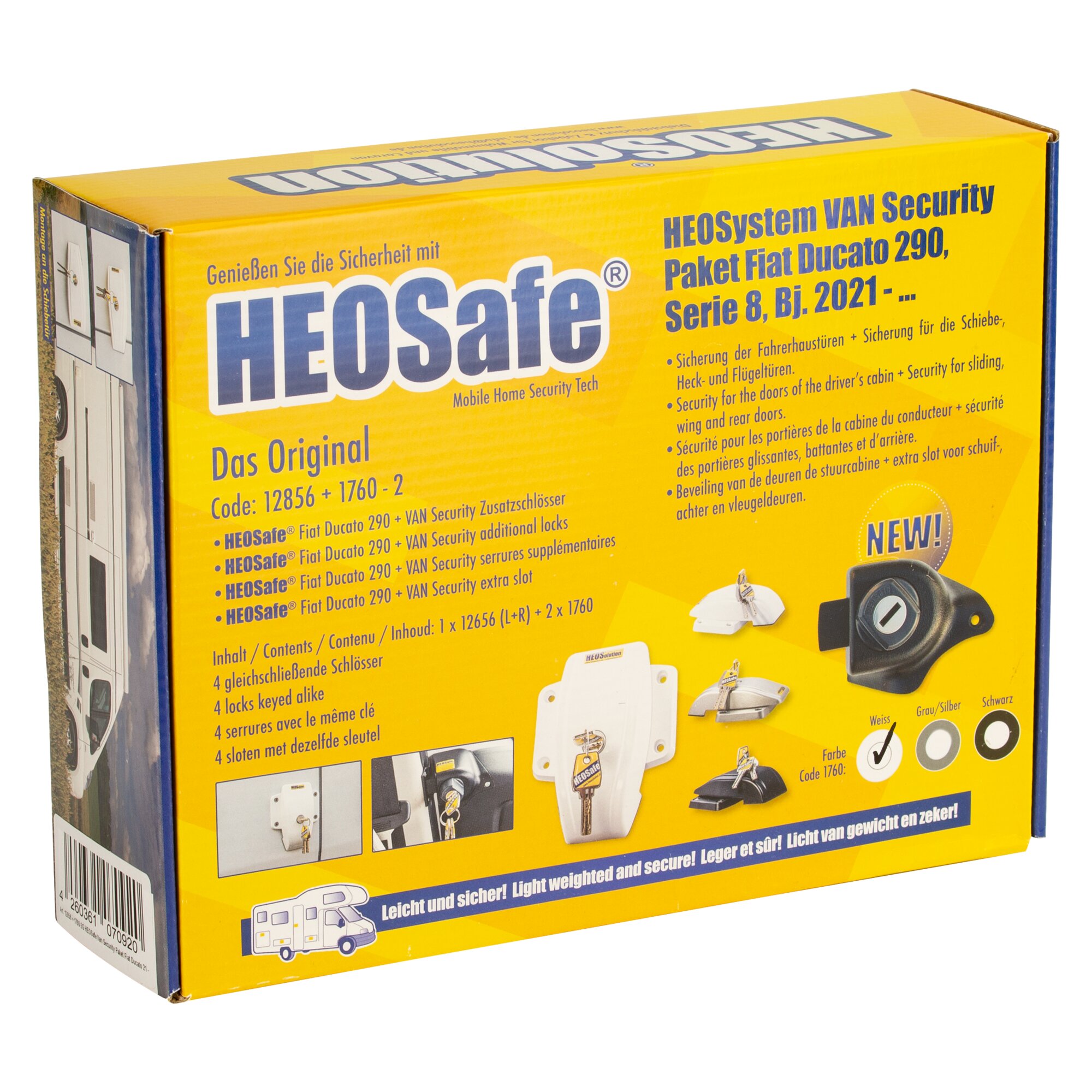 Bestehend aus 1 x HEOSafe® Türsicherung für Fahrerhaustüren Fiat Ducato und 2 x HEOSafe® Van Security (Typ 1760) zur Sicherung von Schiebe- und Heck-/Flügeltüren.