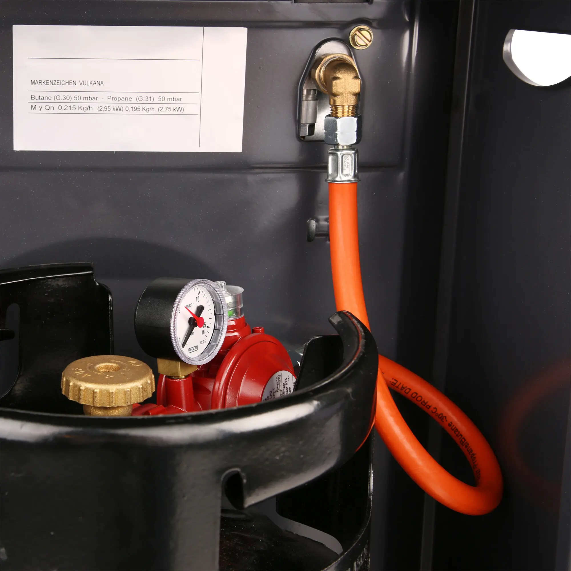 Enthält einen Niederdruckregler Typ EN61-DS mit Manometer. 1,5 kg/h 50 mbar und Gummi-Schlauchleitung Mitteldruck 400 mm, bis -30 °C, beidseitig G ¼ Linksgewinde-Überwurfmutter sowie ein MiniTool. Vorgeschrieben für alle gewerblichen und privaten Kleinflaschenanlagen (z. B. Katalyt- oder Infrarotöfen) im Innenbereich sowie für gewerbliche Kleinflaschenanlagen im Außenbereich.