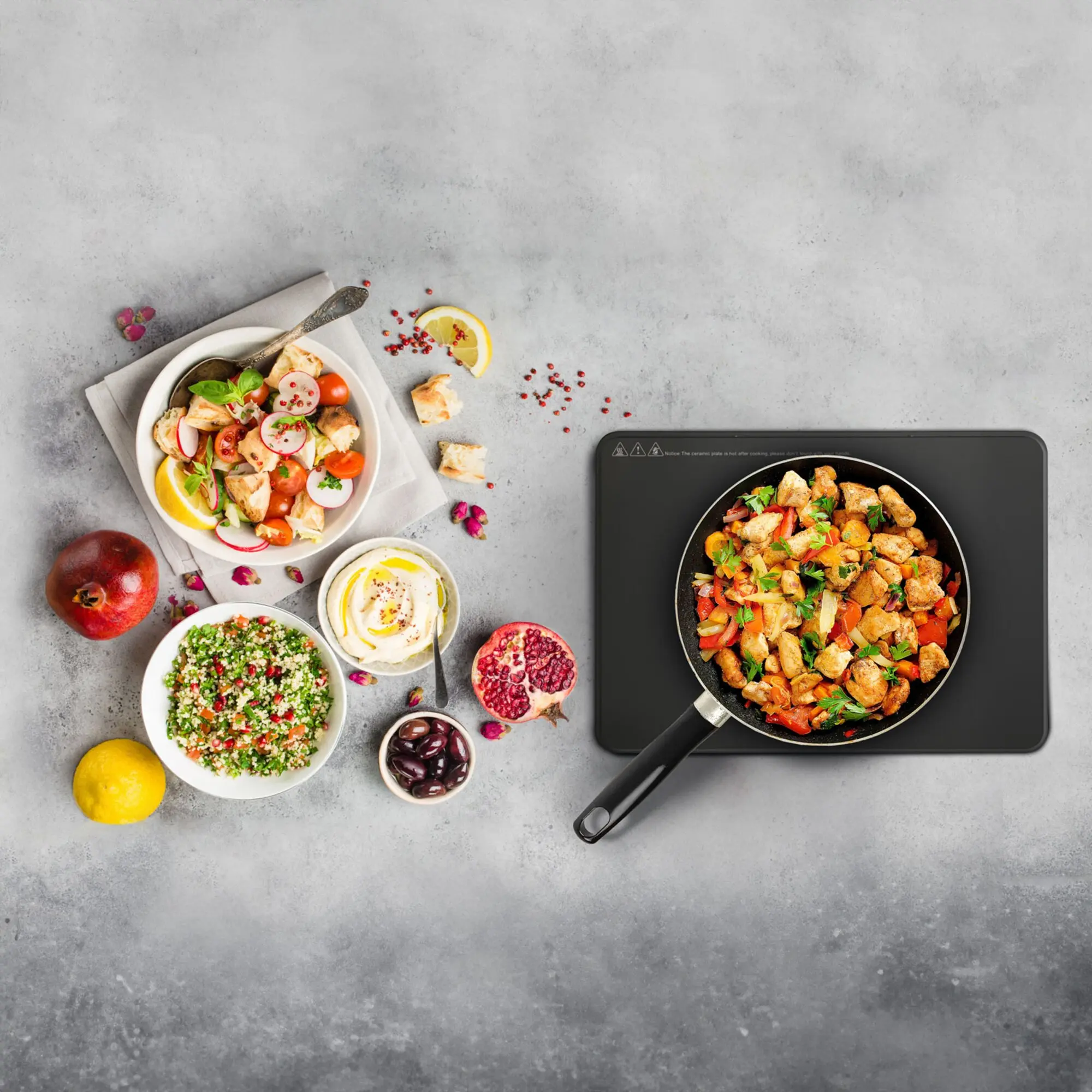 Tragbarer Elektroherd/Grill mit Induktions-Einzelplatte. Solide Konstruktion und modernes Design mit hitzebeständigem PP-Gehäuse und hochbeständiger Glaskeramik-Kochfläche. Ideal für den Einsatz im Freien und beim Camping, dank eines Kochbereichs mit 9 Leistungsstufen (von 300 bis 2000 W), die über Touch-Steuerungsbefehle und LED-Anzeige wählbar sind. Im Lieferumfang ist eine Aluminium-Grillplatte enthalten, die für eine homogene Wärmeverteilung ausgelegt und innen mit Keramik beschichtet ist, um wirklich außergewöhnliches Grillen zu ermöglichen.