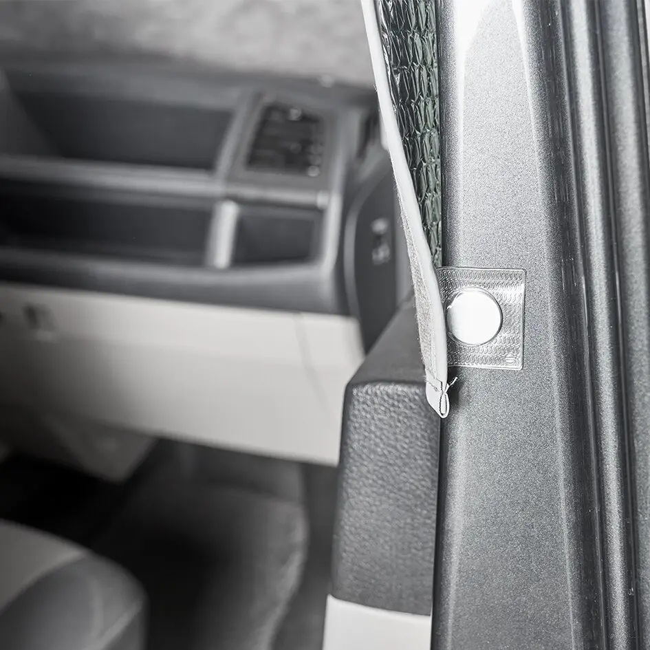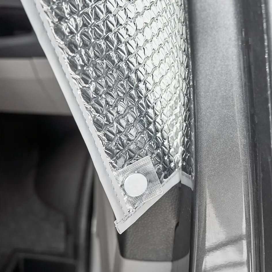 3-teilige Sets aus 4 mm starker Thermofolie für wirkungsvollen Schutz vor Kälte und Lärm. Der graue Vlies zum Wohnbereich hin sorgt für eine angenehme Raumatmosphäre. Die beschichtete Außenfläche isoliert den Innenraum gegen Hitze und das Luftpolster zwischen Scheibe und Isoliermatte sorgt für Wärme­­dämmung. Die Befestigung des Frontteils erfolgt mittels Laschen zwischen Scheibe und Armaturenträger und zwischen Sonnenblende und Dachhimmel. Die Seitenteile werden mit Magneten befestigt, und in den Türen eingeklemmt.