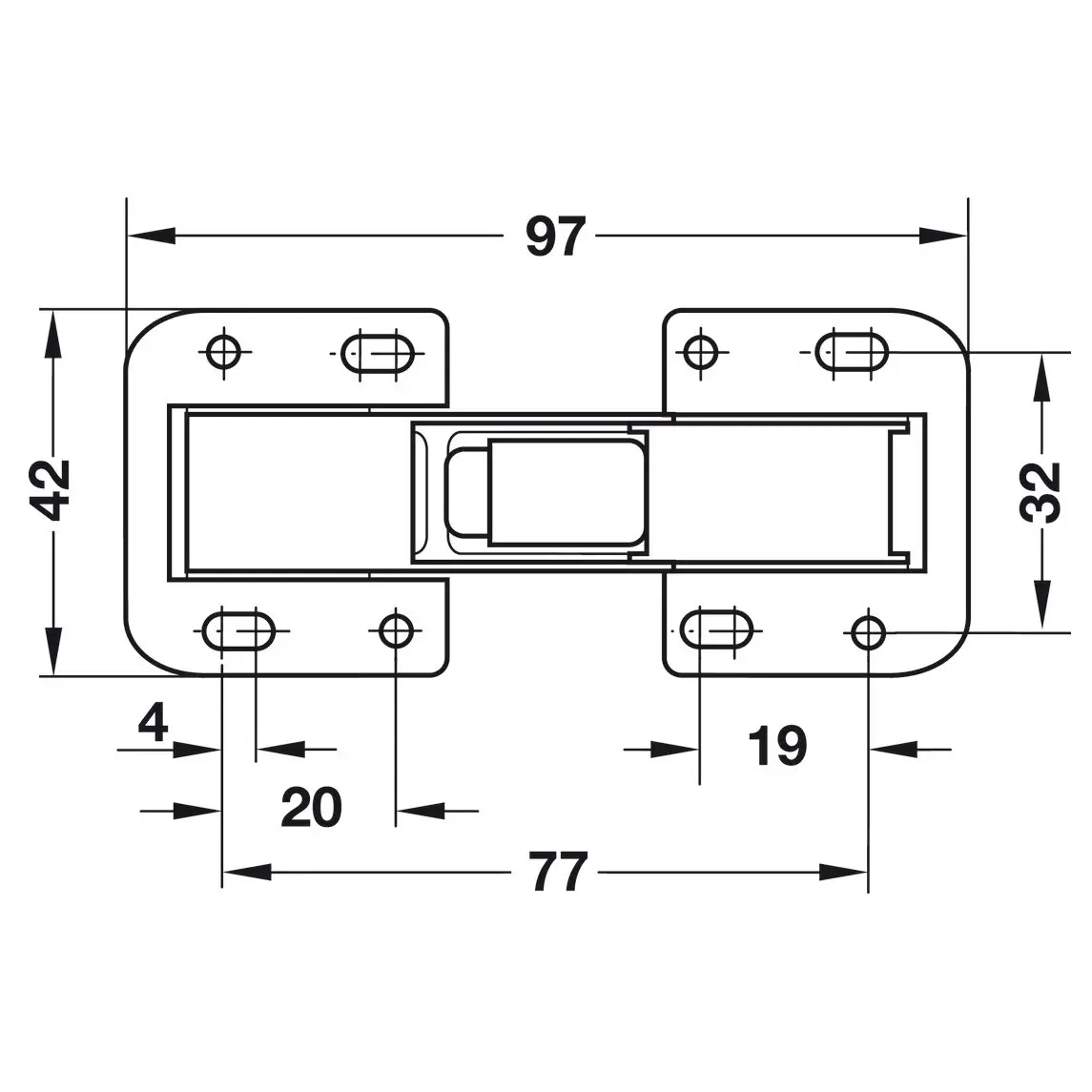 Scharnier Stahl verzinkt mit einem Öffnungswinkel von 90°, Seiten- und Tiefeneinstellung über Langlöcher, mit Schließautomatik. Für Türdicke ab 16 mm und Seitenwanddicke 16 – 22 mm.