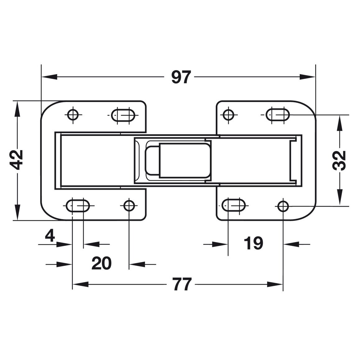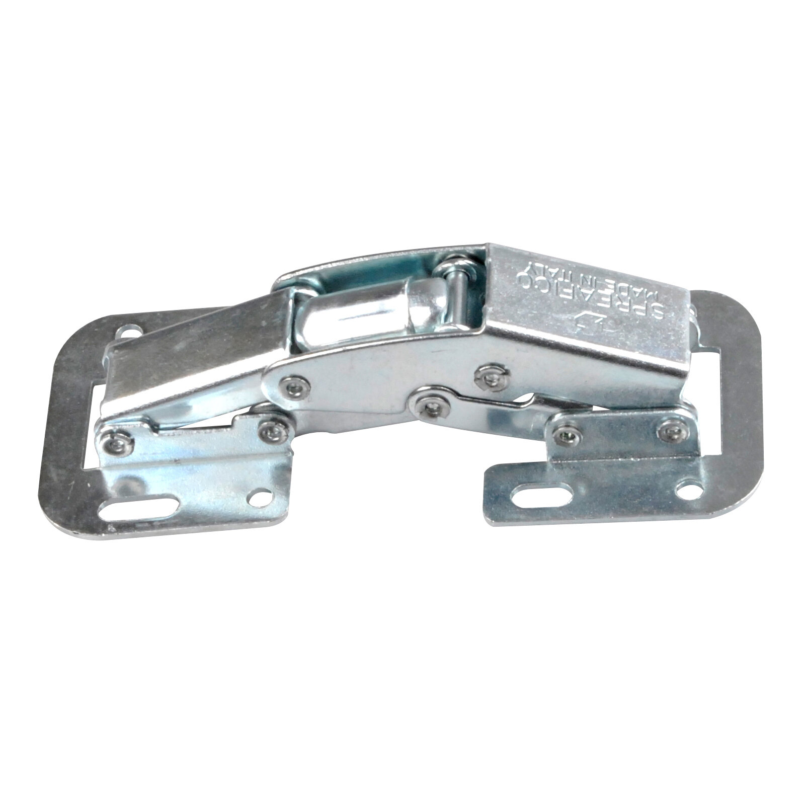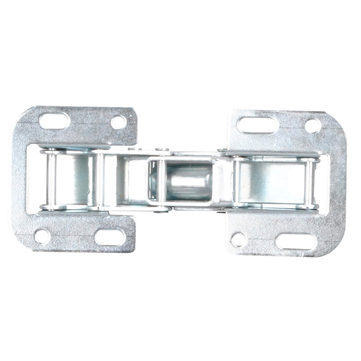 Scharnier Stahl verzinkt mit einem Öffnungswinkel von 90°, Seiten- und Tiefeneinstellung über Langlöcher, mit Schließautomatik. Für Türdicke ab 16 mm und Seitenwanddicke 16 – 22 mm.