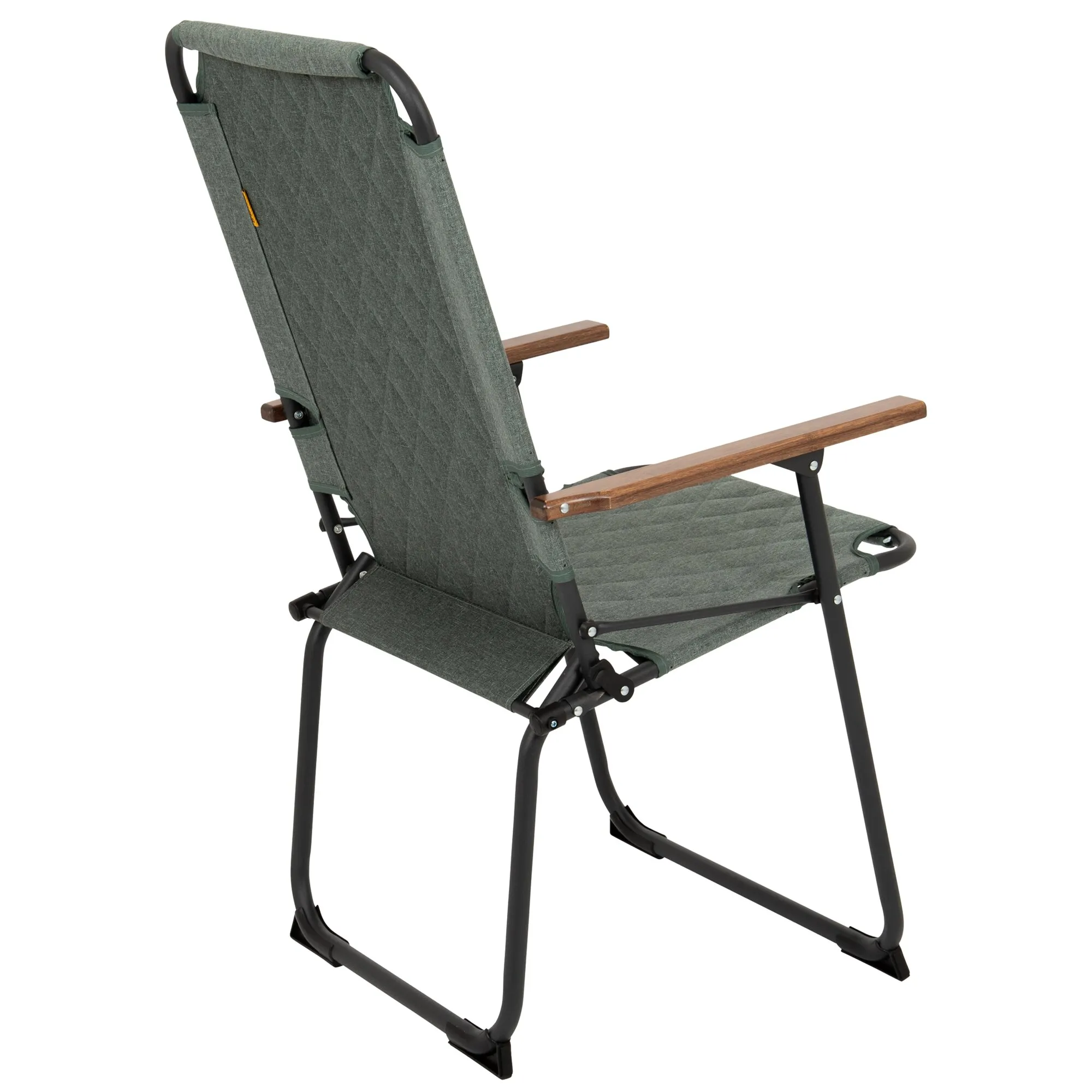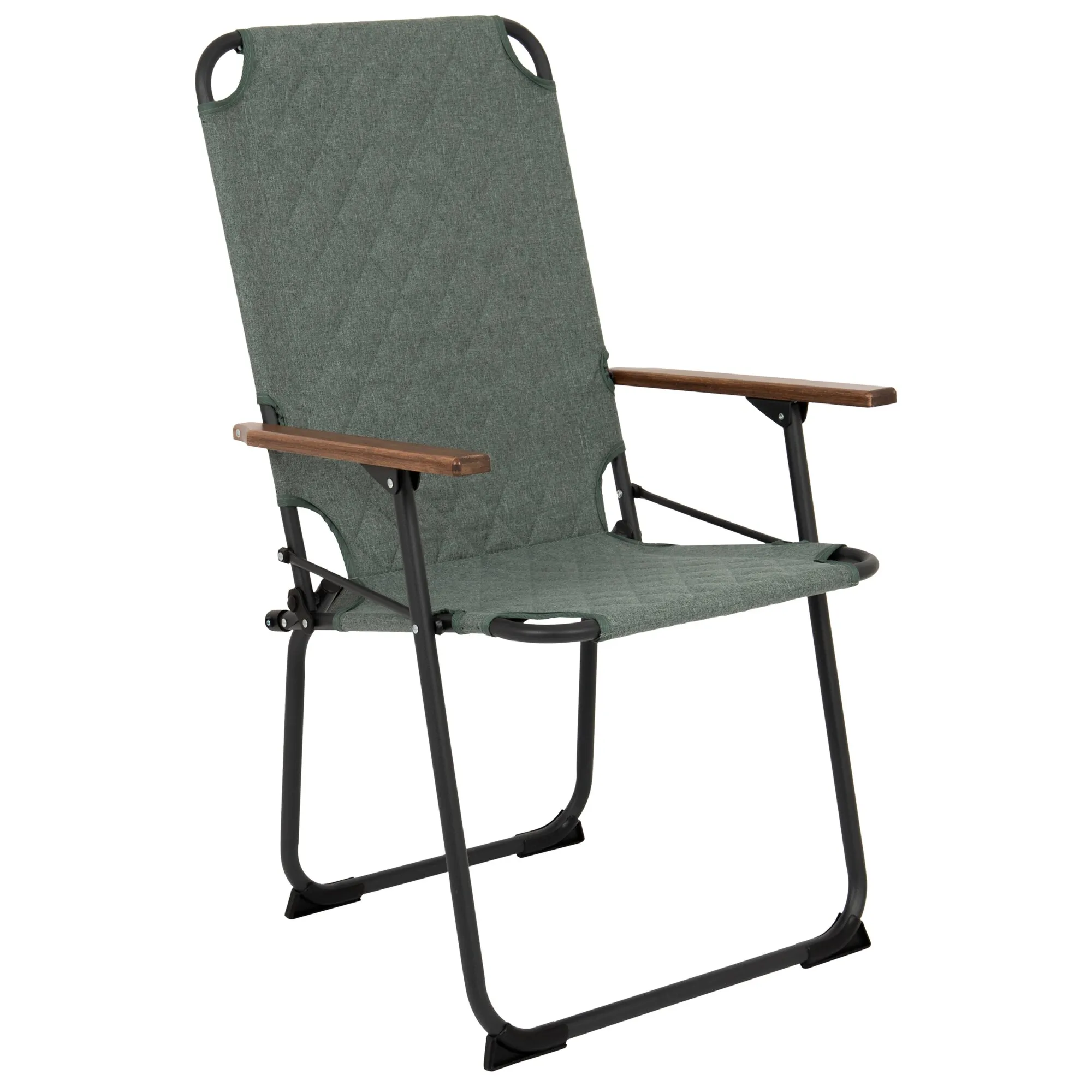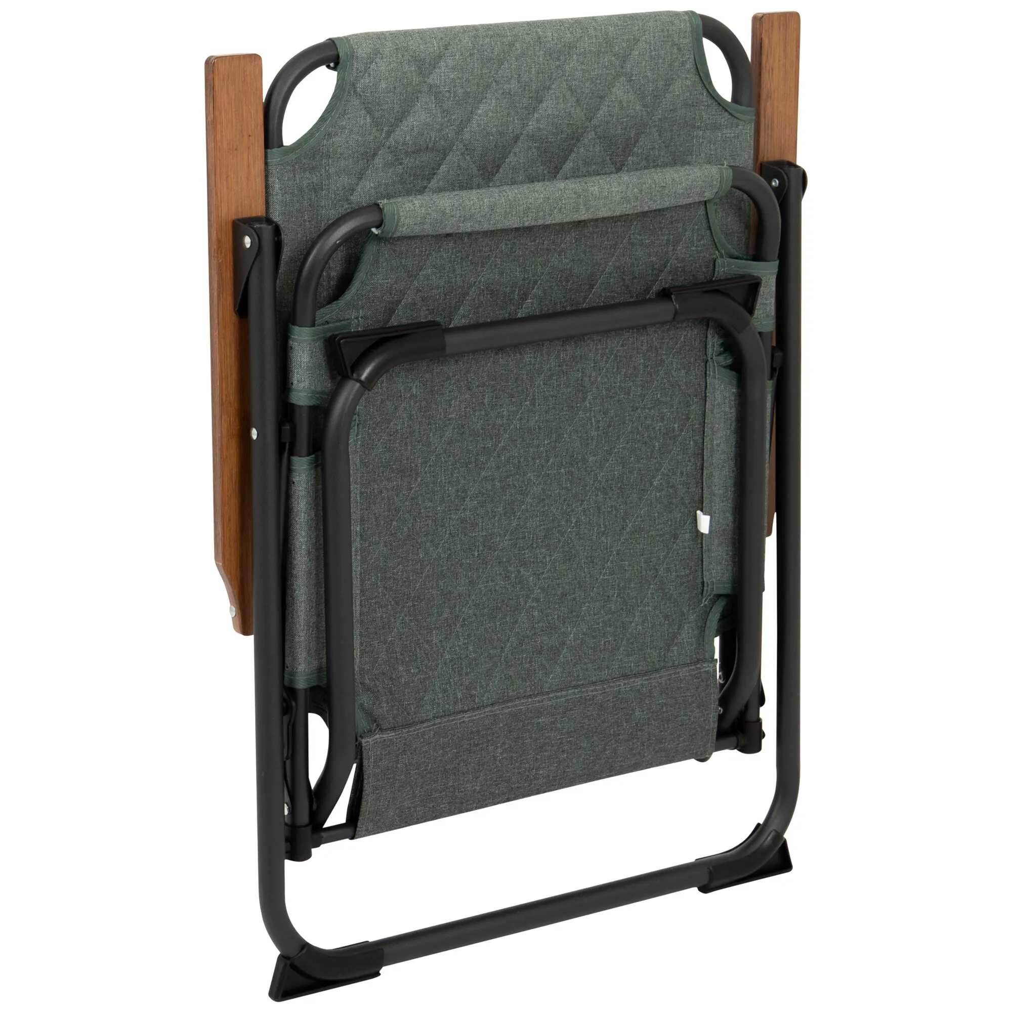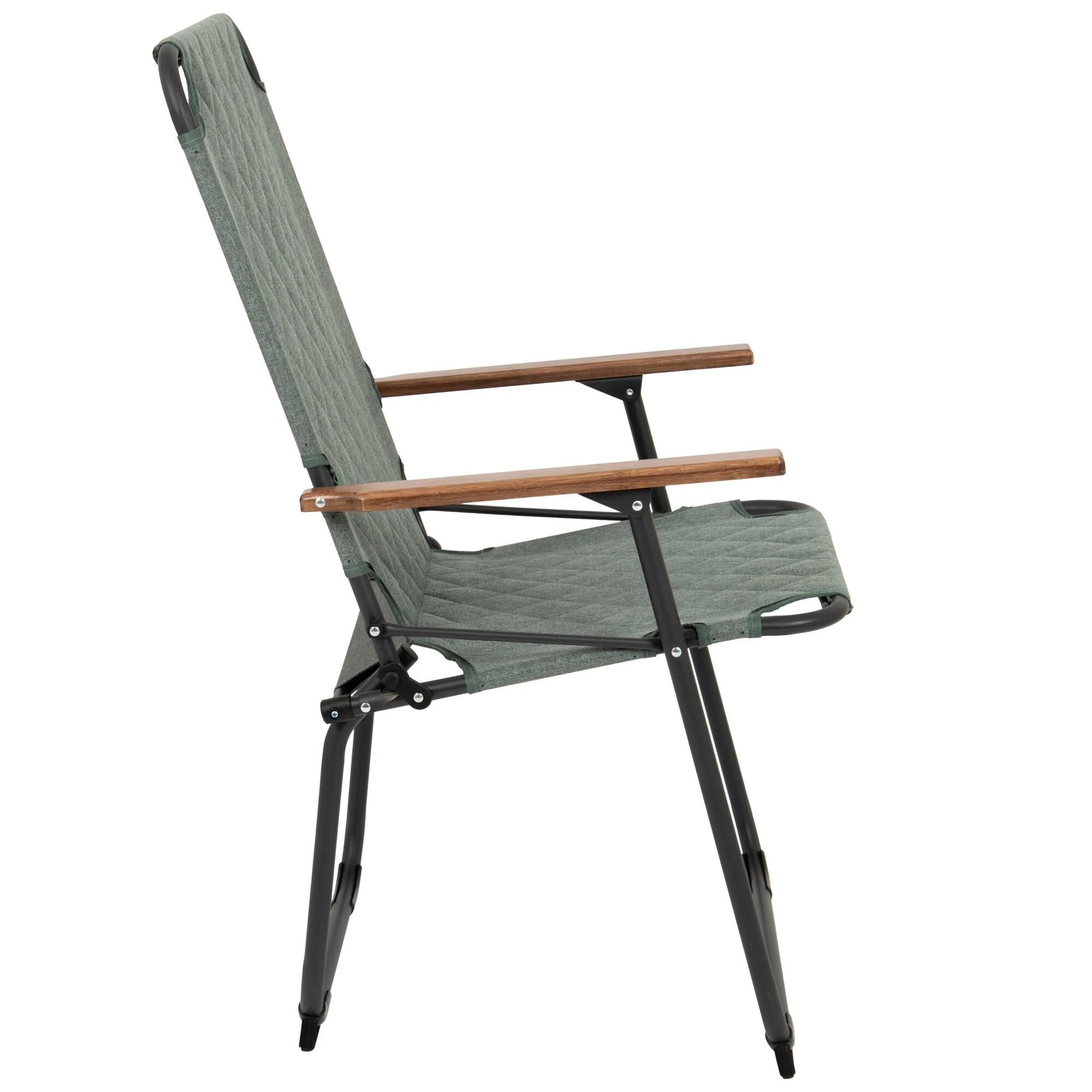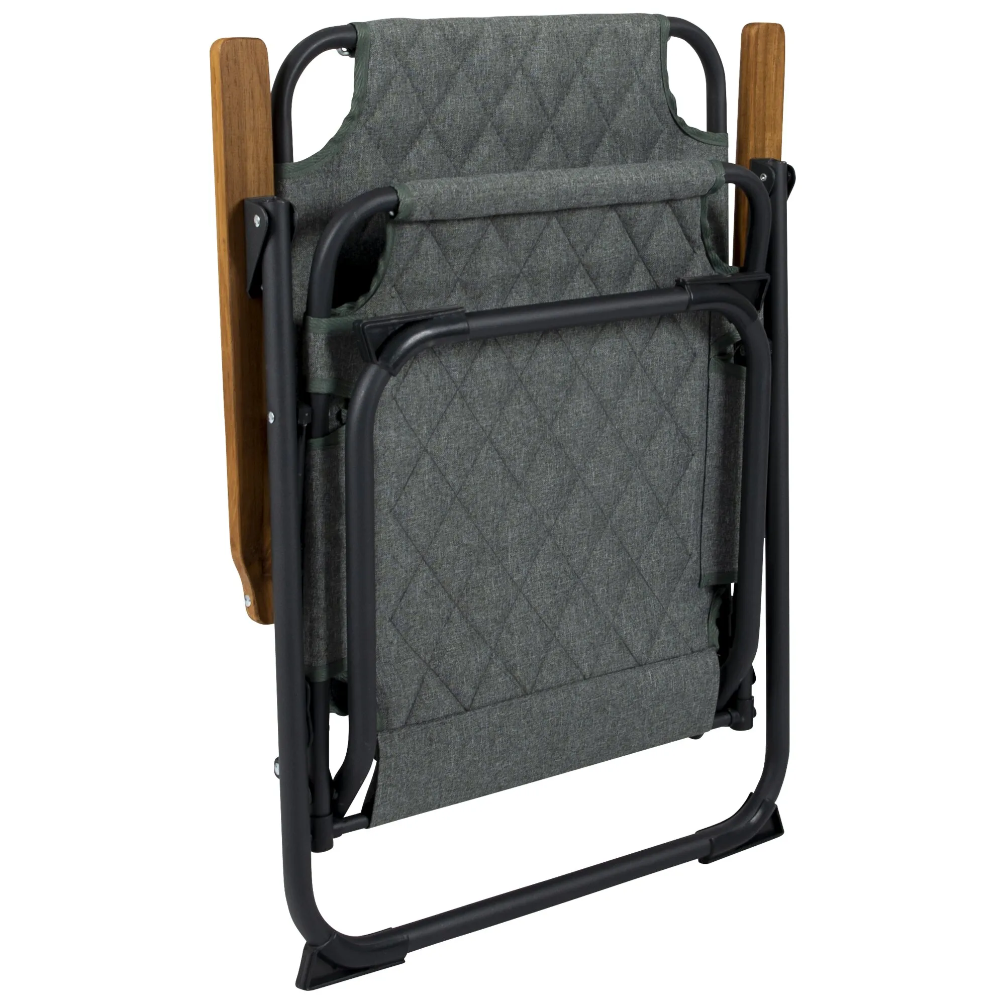 Extrahoher und -breiter Klappstuhl im modernen Industrie-Look. Ausgestattet mit Kationic-Polsterung, einem leichten Aluminiumrahmen und Armlehnen aus Teakholz. Inkl. Stabilisatoren und Sicherheitsschloss gegen unerwünschtes Falten.