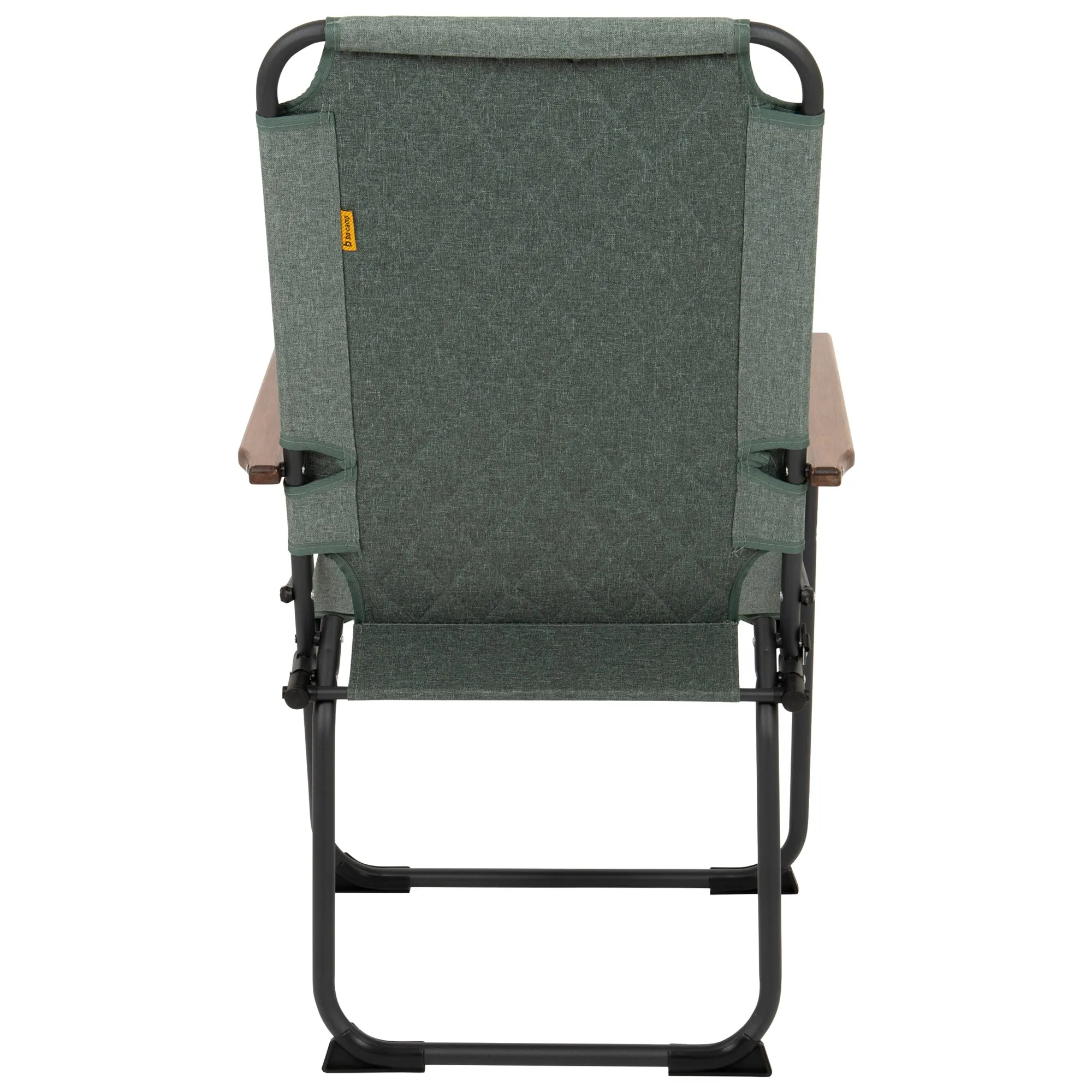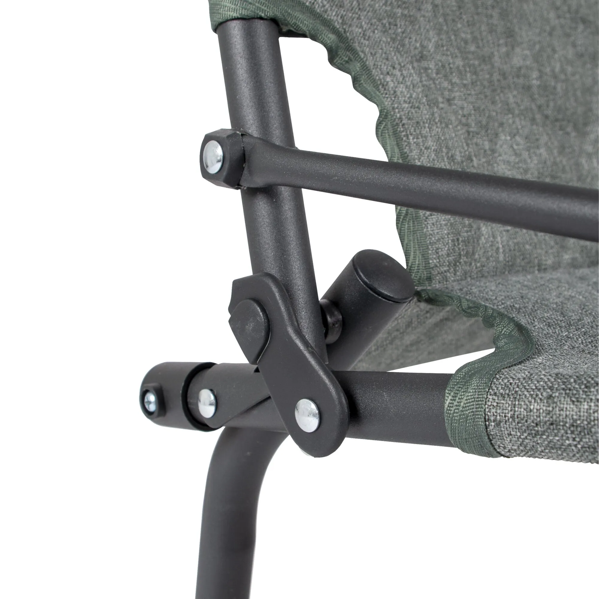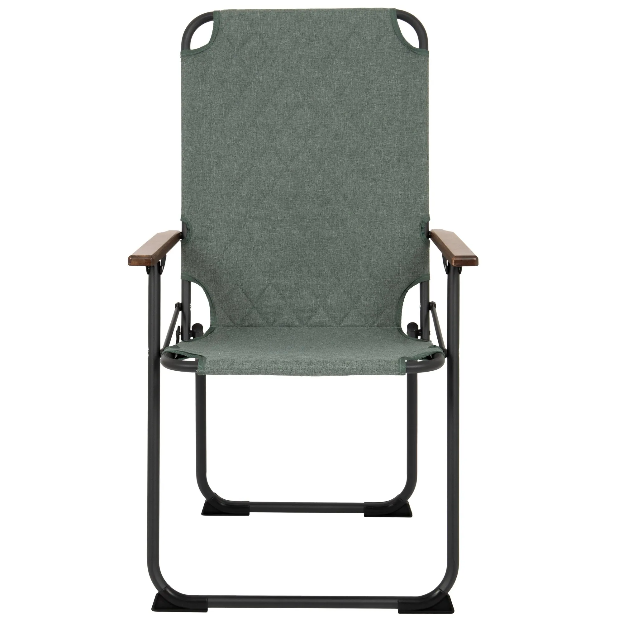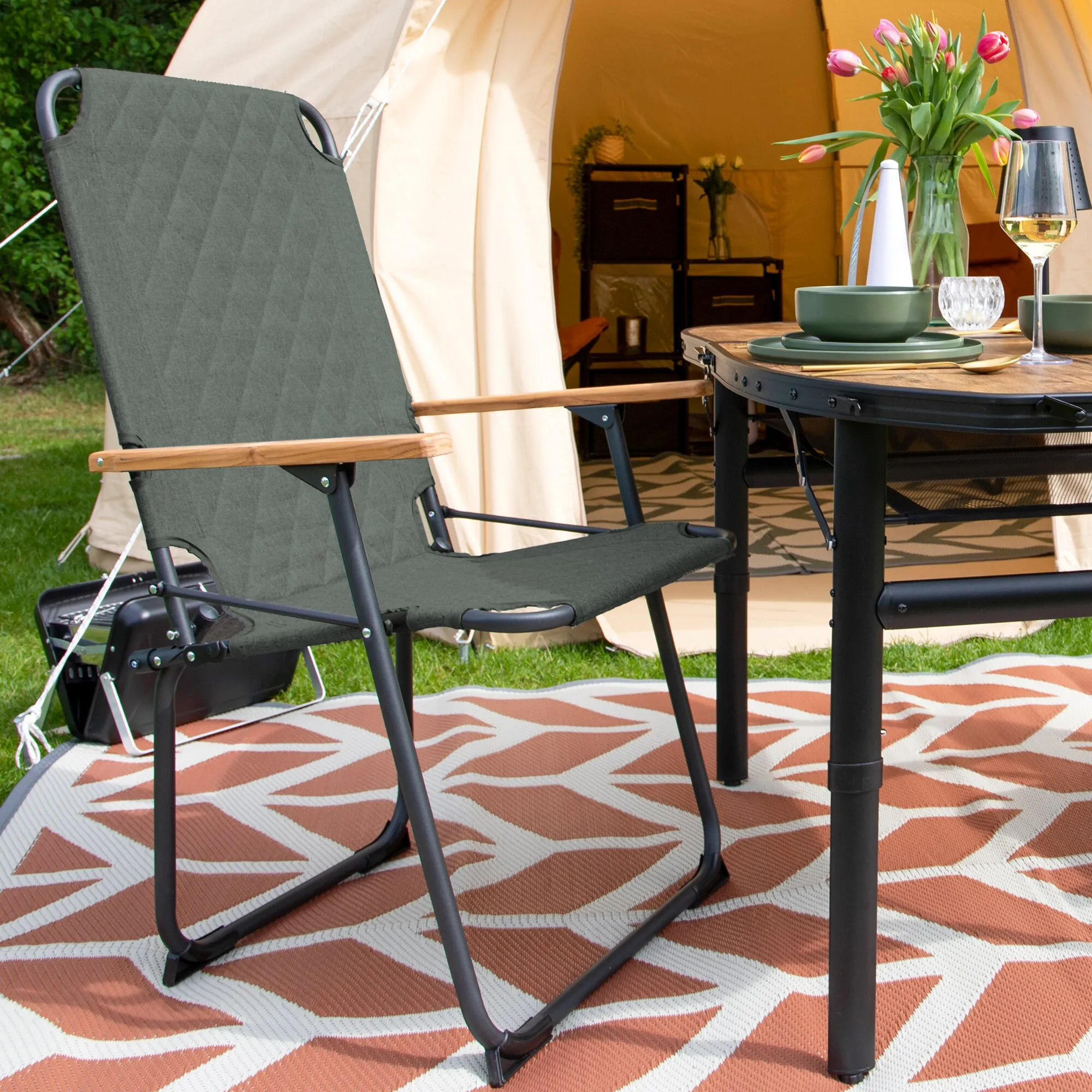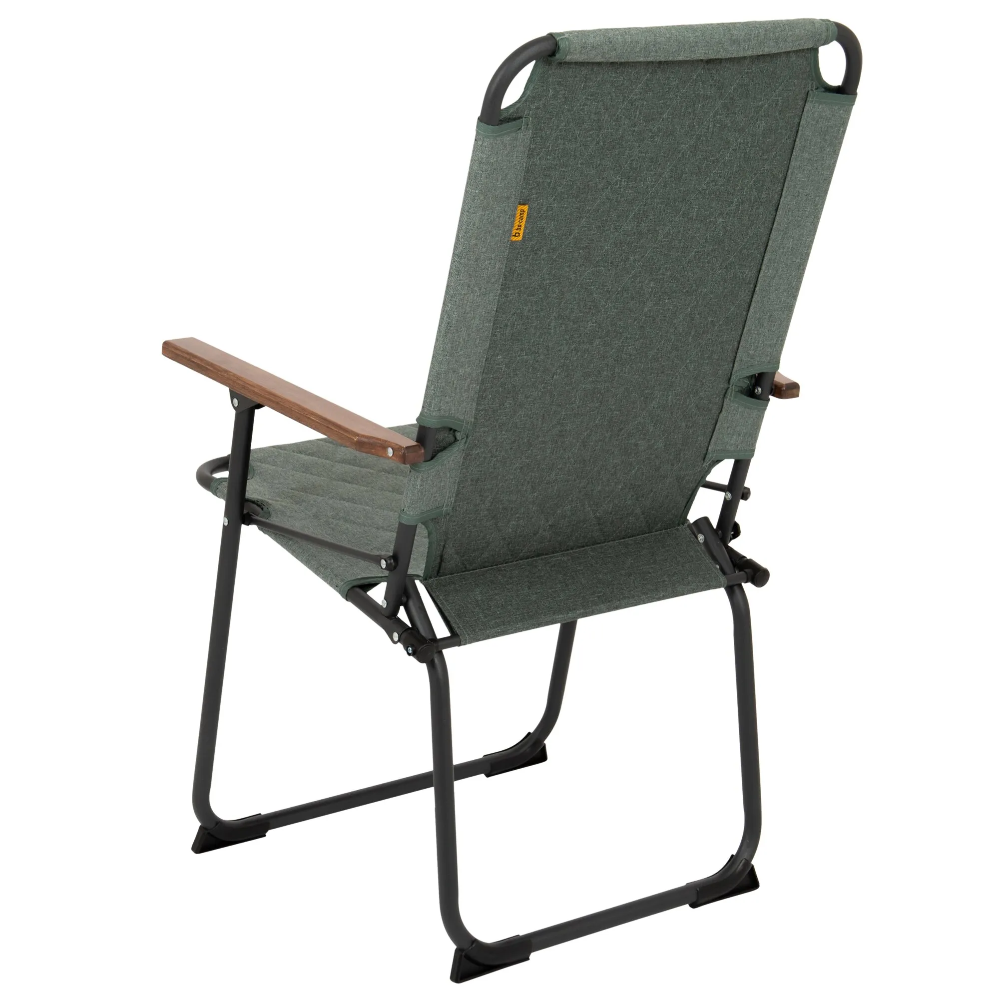 Extrahoher und -breiter Klappstuhl im modernen Industrie-Look. Ausgestattet mit Kationic-Polsterung, einem leichten Aluminiumrahmen und Armlehnen aus Teakholz. Inkl. Stabilisatoren und Sicherheitsschloss gegen unerwünschtes Falten.