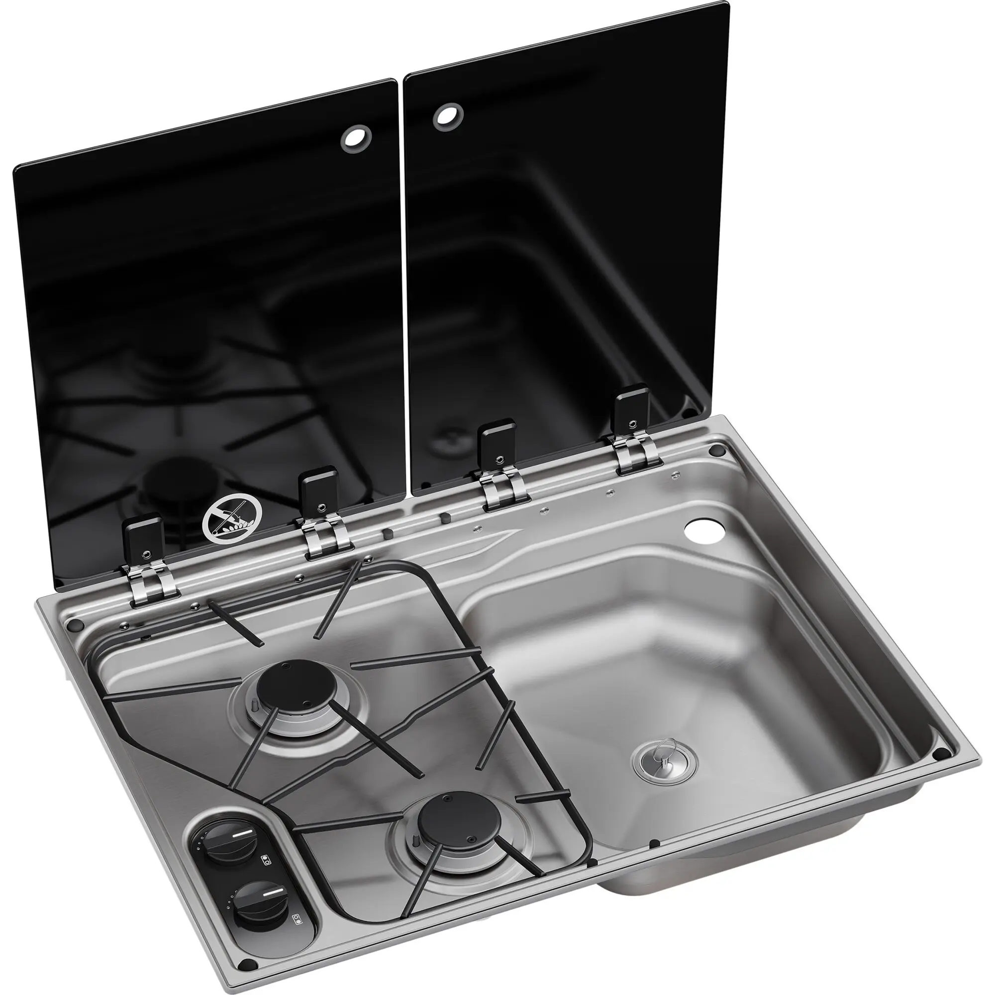 Einbau-Kocher-Spülenkombination mit separaten Abdeckungen aus temperaturbeständigem Sicherheitsglas und Gasabschaltfunktion bei geschlossener Abdeckung; Bohrung für Wasserhahn (ø 39 mm), Art.-Nr. 41 555. Mit Sicherheitszündsystem und elektronischer Zündung (Anschlussspannung 12 Volt wird benötigt). Leistung 1 x 1,1 kW, 1 x 1,6 kW, Verbrauch 116,8 g/h. Einbautiefe 14 cm, Ausschnittmaße 58,2 x 43,8 cm, Außenmaße 60 x 45 cm, Gewicht 4,5 kg.